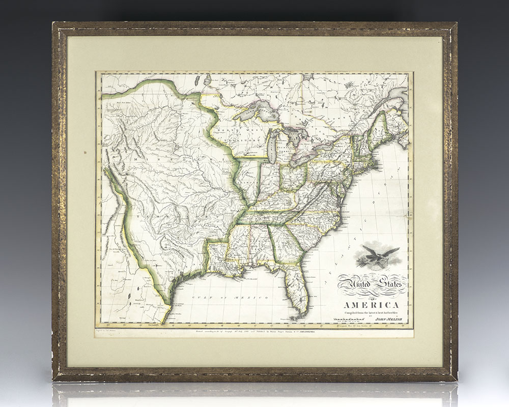 Rare first edition map of the United States of America based on the of one of the earliest U.S. mapmakers John Melish. The map displays a view extending west to the Rocky Mountains, including a detailed view of the Mississippi and Missouri Rivers based on the expeditions of Lewis & Clark, Pike and Melish with hand-colored borders. Matted and framed, the entire piece measures 24.5 inches by 21.25 inches. Rare and handsomely presented.