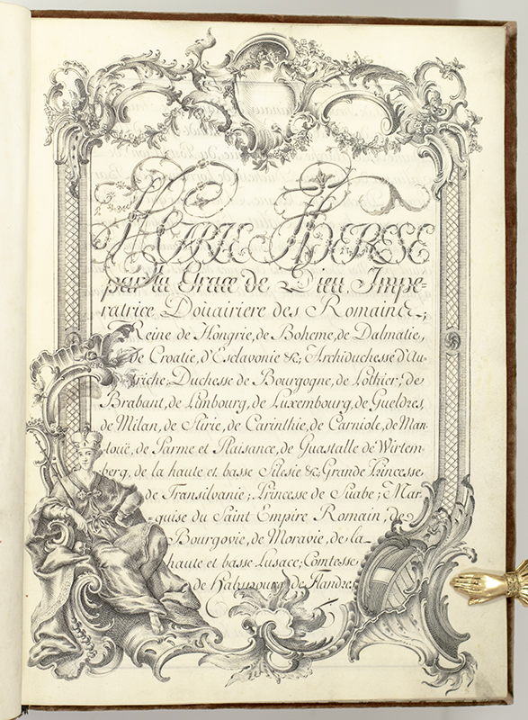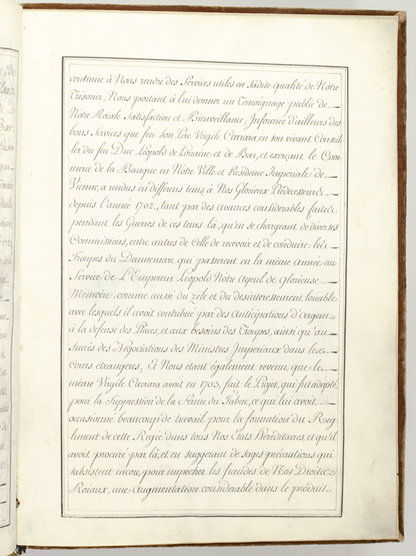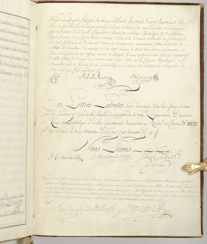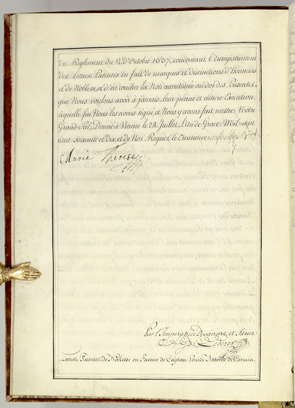 Rare 18th century French Patent of Nobility for Cajetau-Louis-Antoine de Carrara. Folio, bound in full velvet, the patent is comprised of five vellum leaves, the first with calligraphy within an elaborate engraved border; the third leaf with a gilt-painted armorial miniature, all edges gilt, rope bound in. Dated November 13, 1710, the patent is signed by Marie Therese, J. G. Van de Veld, F. L. Gilbert, and J. DeWitte. In very good condition.