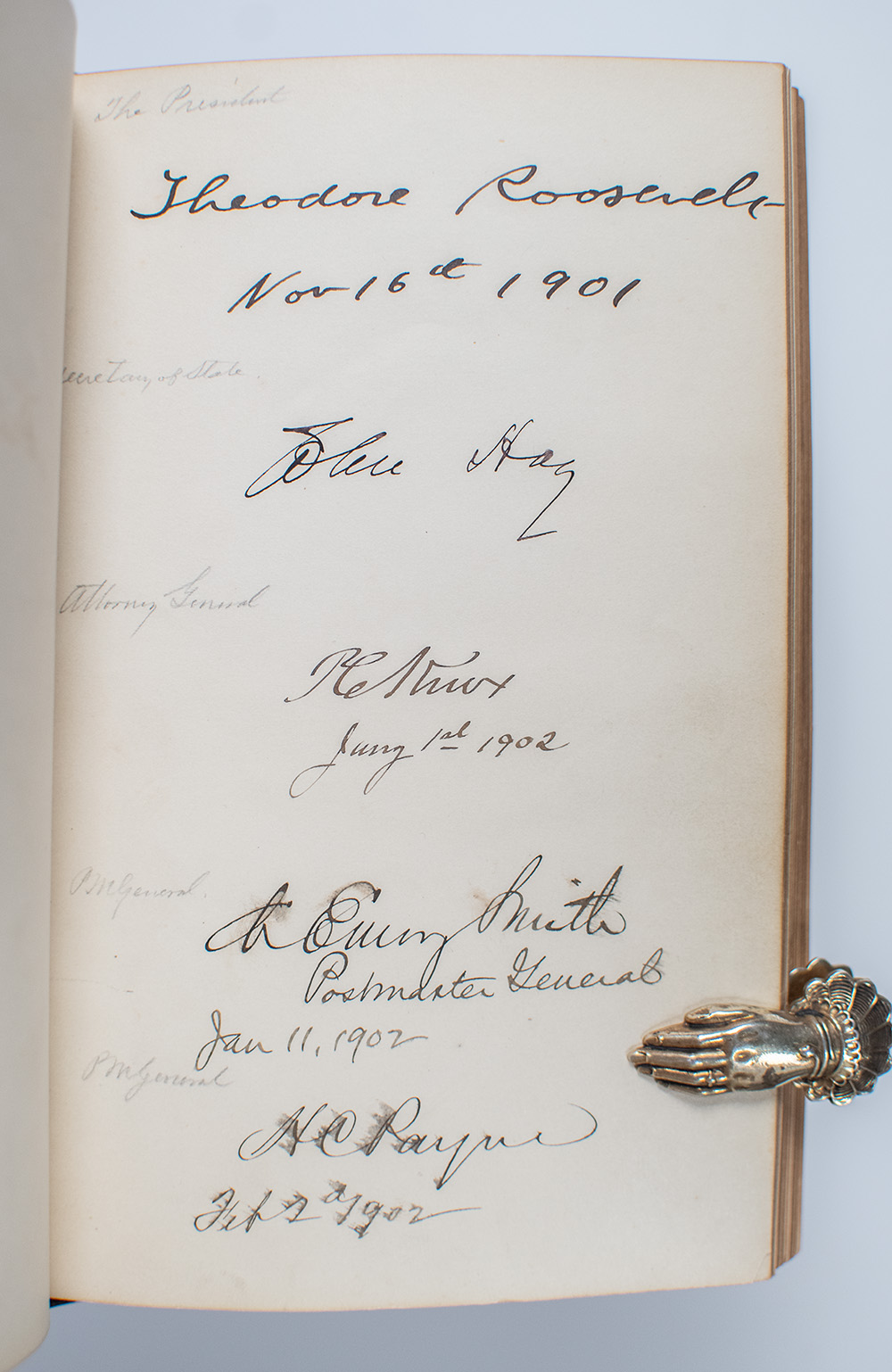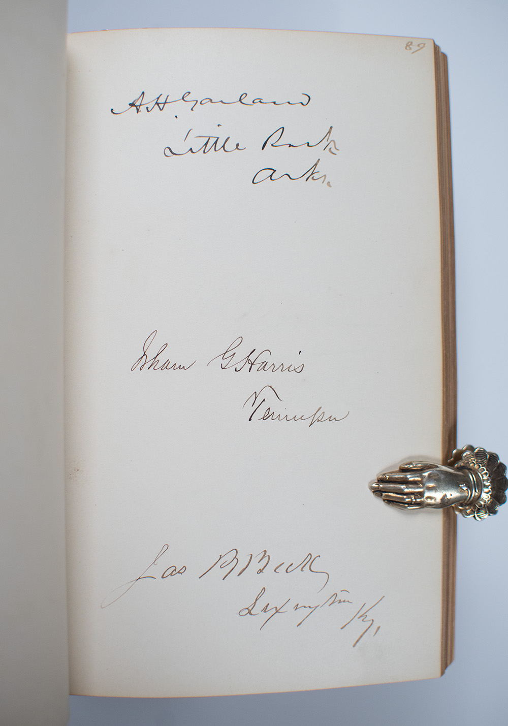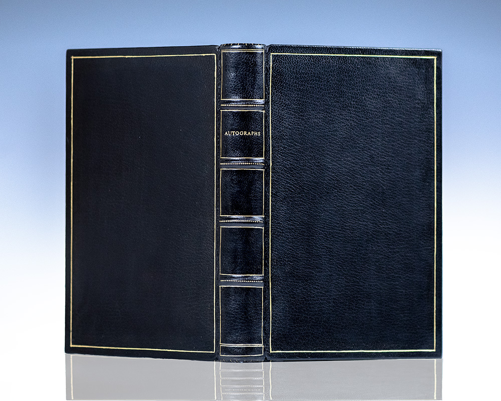 Rare and remarkable autograph book compiled by West Virginia senator and industrialist Henry Gassaway Davis (1823-1916) containing 289 historic autographs, including seven presidents, seven vice presidents, and scores of members of the Senate, House of Representatives, and presidential cabinets, as well as a few other 19th-century notables. Octavo, bound in full crushed levant morocco by the Harcourt Bindery with gilt titles and tooling to the spine in six compartments within raised gilt bands, gilt ruling to the front and rear panels, gilt-scrolled inner dentelles stamp-signed by the Harcourt Bindery, all edges gilt, title page printed in gilt. With Davis' ownership signature and subsequently that of his daughter to the title page, "H. G . Davis, 1872" and "Grace T. Davis, 1887" (Miss Davis was 18 in 1887). The book has approximately 300 unnumbered pages but only the first 144 (which were numbered in pencil by hand at some point) include the autographs, generally three on each side of a page, most often including the person's home state, or, in the case of cabinet members, their office title. The highlights of the album are the signatures of seven presidents, representing a half-century of American politics: U. S. Grant, Rutherford B. Hayes, James A. Garfield, Grover Cleveland, Benjamin Harrison (twice), William McKinley, and Theodore Roosevelt. Also included are seven vice presidents - Hannibal Hamlin, Schuyler Colfax, Henry Wilson, William A. Wheeler, Levi P. Morton, Garrett A. Hobart, and Charles W. Fairbanks - and one first lady, Frances F. Cleveland. With the later presidents' autographs are several examples of partial cabinets, including: Harrison (Secretary of the Treasury Charles Foster, Secretary of War Stephen B. Elkins, Attorney General William H. H. Miller, Postmaster General John Wanamaker, Secretary of the Navy Benjamin F. Tracy, Secretary of the Interior John W. Noble, and Secretary of Agriculture Jeremiah M. Rusk), Cleveland (Secretary of State Walter Q. Gresham, Secretary of the Treasury John G. Carlisle, Secretary of the Navy Daniel S. Lamont, Attorney General Richard Olney, Postmaster General Wilson S. Bissell, Secretary of the Navy Hilary A. Herbert , Secretary of the Interior Hoke Smith, and Secretary of Agriculture J. Sterling Morton), McKinley (Secretary of State John Sherman, Secretary of the Treasury Lyman J. Gage, Secretary of War Russel A. Alger, Attorney General Joseph McKenna, Postmaster General James A. Gary, Secretary of the Navy John D. Long, Secretary of Agriculture James Wilson, and Secretary of the Interior Cornelius N. Bliss), and Roosevelt (Secretary of State John Hay, Attorney General Philander C. Knox, Postmasters General Charles Emory Smith and Henry C. Payne, and Secretary of the Interior Ethan A. Hitchcock). Others significant names include influential members of the House and Senate, many of whom were celebrated veterans of the Civil War. These include: Hamilton Fish, William M. Evarts, Charles Sumner, David Davis, Simon Cameron, James G. Blaine, George S. Boutwell, Augustus H. Garland, Roscoe Conkling, Ambrose Burnside, John A. Logan, John B. Gordon, Carl Schurz, Wade Hampton, John T. Morgan, Henry W. Slocum, and William Mahone. Interestingly, one page features the autographs of James Cardinal Gibbons, Archbishop of Baltimore, and famed agnostic lecturer Robert G. Ingersoll. In fine condition. A remarkable collection spanning half a century of American politics.