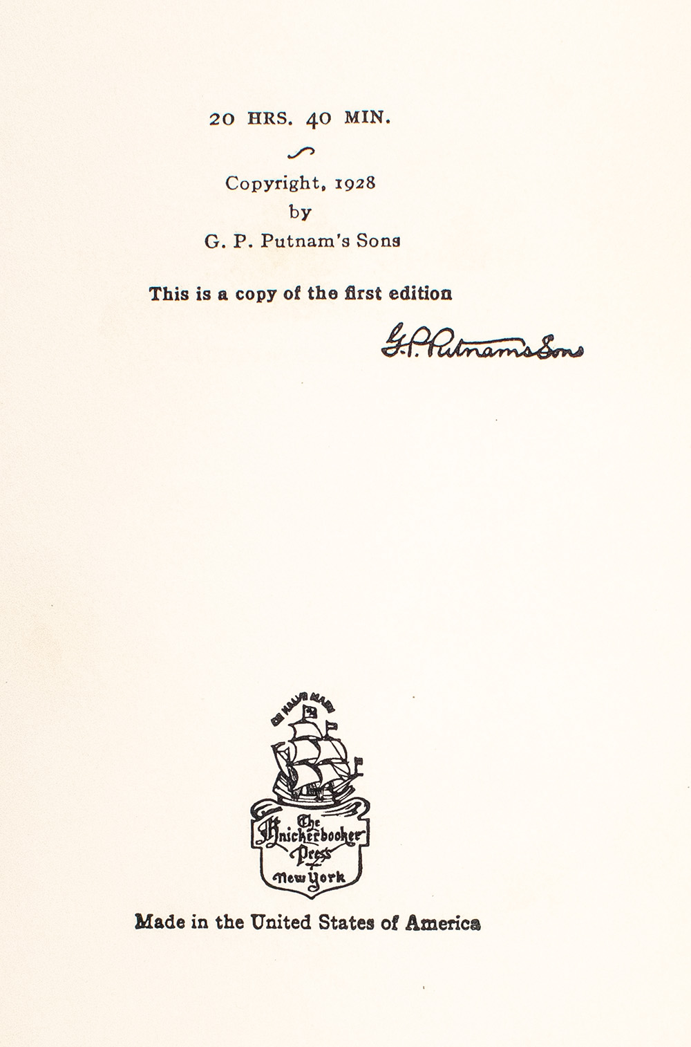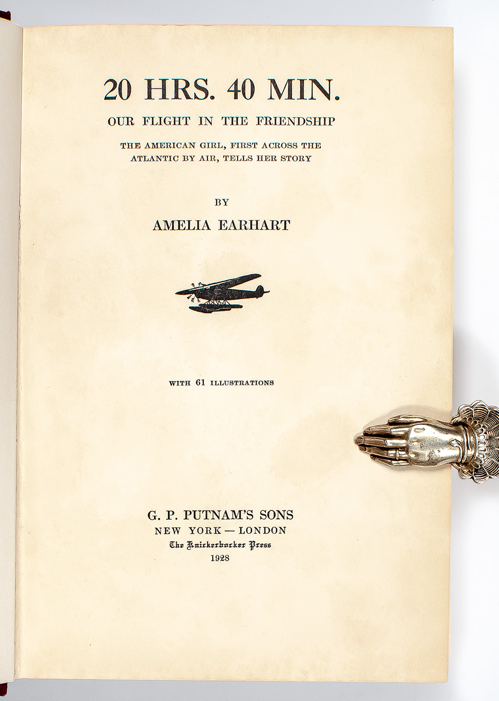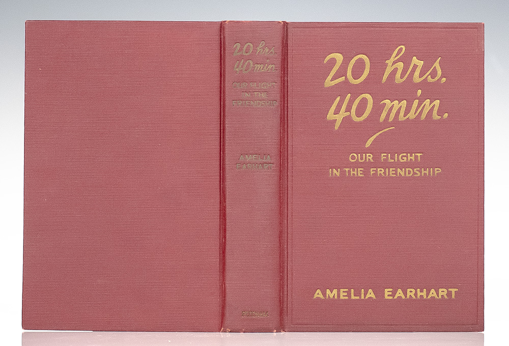 “EVERYONE HAS OCEAN’S TO FLY, IF THEY HAVE THE HEART TO DO IT. IS IT RECKLESS? MAYBE. BUT WHAT DO DREAMS KNOW OF BOUNDARIES?”: FIRST EDITION OF 20 HRS. 40 MIN. OUR FLIGHT IN FRIENDSHIP; SIGNED BY AMELIA EARHART
