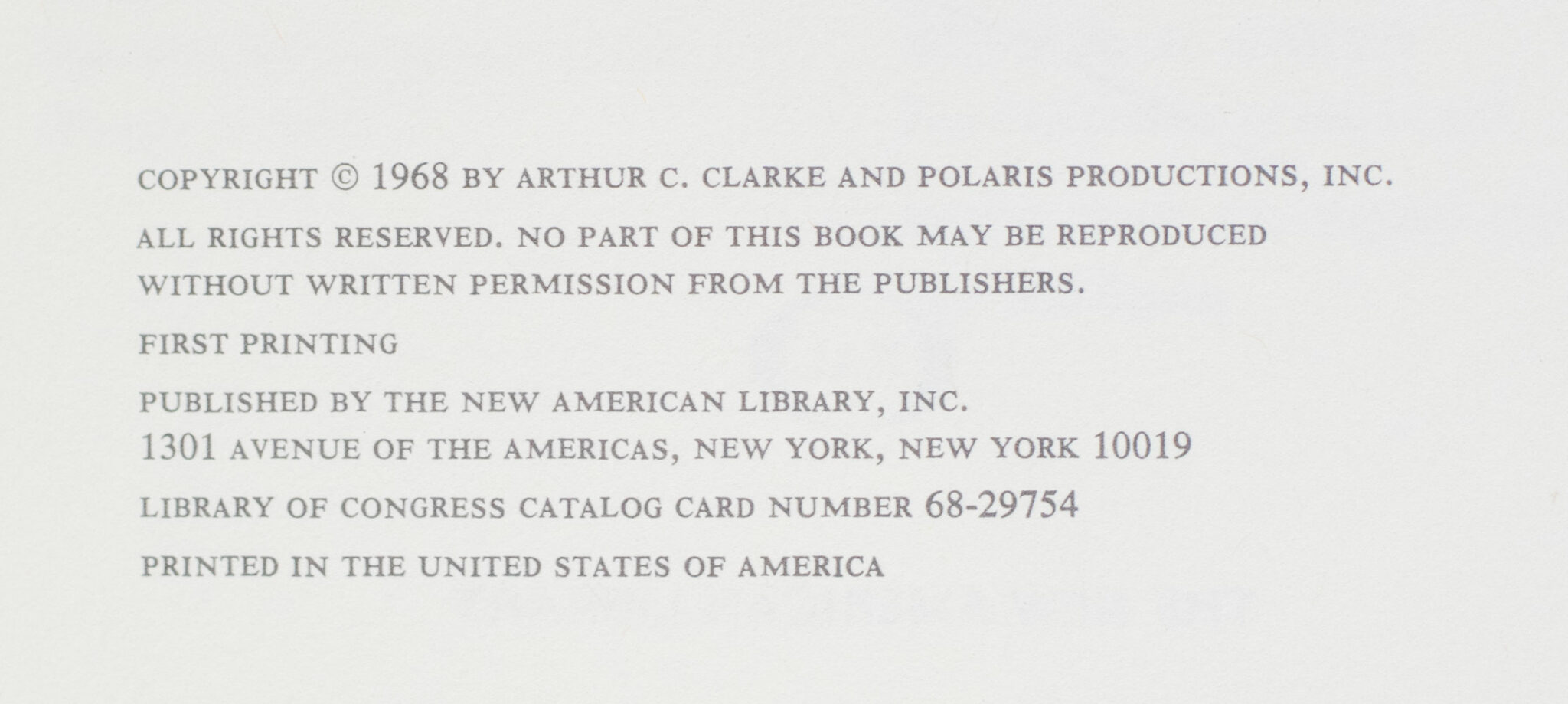 First edition of the novel of the landmark “proverbial good science fiction movie” created by Arthur C. Clarke and Stanley Kubrick, starring Keir Dullea and Gary Lockwood. Octavo, original half cloth. Lengthily signed by Keir Dullea on the title page, "Open the pod bay door, Hal Keir Dullea." Additionally signed by Keir Dullea on the front panel of the dust jacket. Near fine in a near fine dust jacket. Housed in a custom half morocco clamshell box made by the Harcourt Bindery. A unique example.