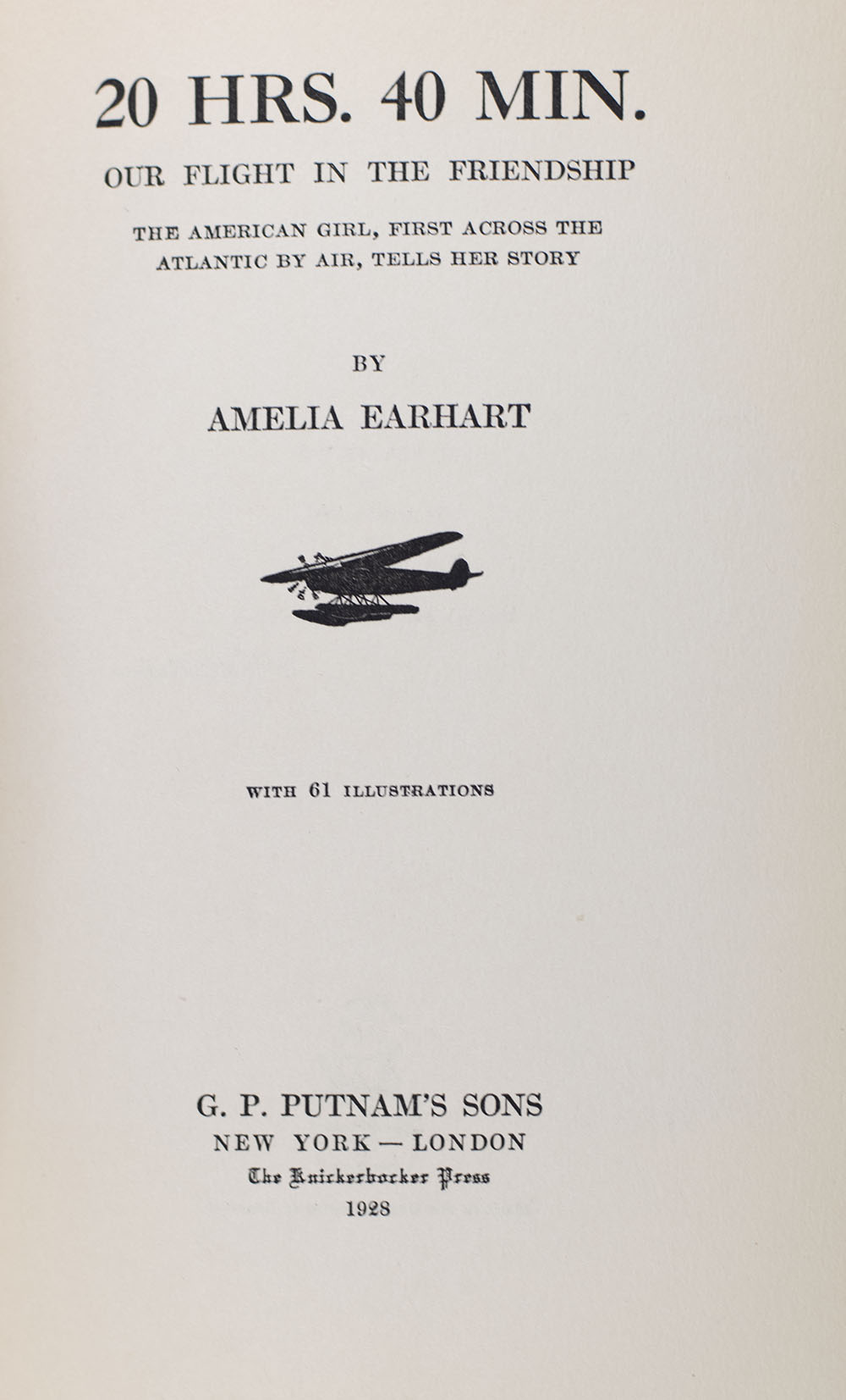 “Everyone has ocean’s to fly, if they have the heart to do it. Is it reckless? Maybe. But what do dreams know of boundaries?”: First edition of Amelia Earhart's 20Hrs. 40 Min. Our Flight In Friendship; Signed by Her and in the scarce original dust jacket