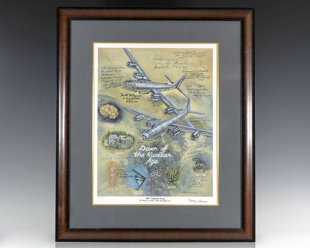 Rare limited "Dawn of the Nuclear Age" print signed by the thirteen surviving crew men of the Enola Gay, including Edward Teller and Norman Ramsey. Number 377 of 500 copies signed by the artist, Bob Robbins, the print depicts a glorification of a futuristic nuclear age with symbols of space exploration, nuclear energy, plant breeding, and nuclear medicine. Signed and inscribed by Enola Gay crew members Pilot Paul Tibbets, Navigator Dutch Van Kirk, Weapons Test Officer Morris Jeppson, and Radio Operator Richard Nelson; Bockstar crew members Commander Charles Sweeney, Weaponeer Frederick Ashworth, Harold Agnew, and Fred J. Oliver; flight engineer John Kuharek; and scientists Edward Teller ("the father of the hydrogen bomb") and Manhattan Project scientist and Nobel Prize winner Norman Ramsey. In fine condition. Matted and framed. The entire piece measures 26.5 inches by 22.5 inches. An exceptional collection of signatures.