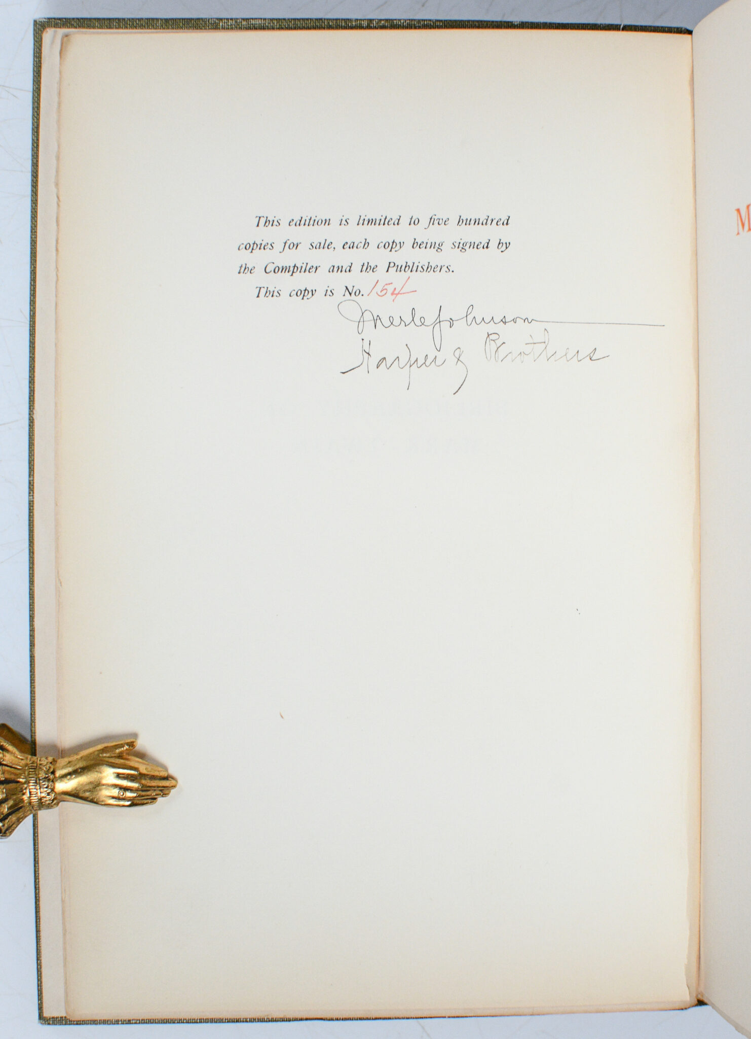 First limited edition of this list of first editions in book form and of first printings in periodicals. Octavo, original publisher's cloth with paper titles to the spine, top edge gilt. One of 500 numbered copies, this is number 154. Boldly signed by compiler Merle Johnson and the publisher Harper & Brothers on the limitations page. In fine condition.