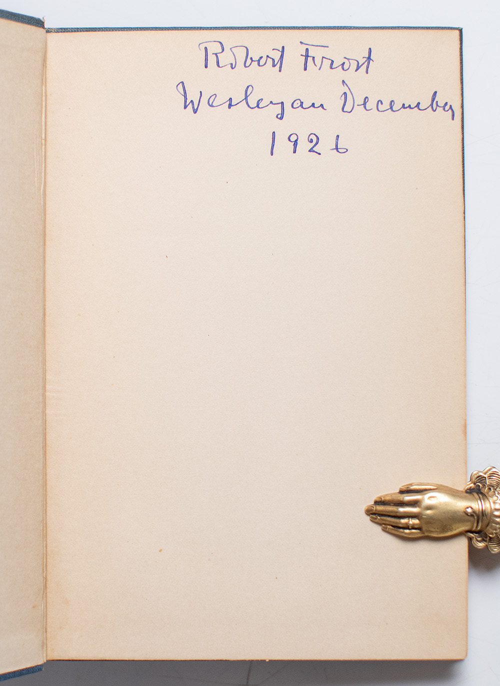 First American edition of Frost's first published work. Octavo, original publisher's cloth, gilt title to the front panel. Boldly signed and dated by the poet on front free endpaper, "Robert Frost Wesleyan December 1926." Ownership signature on front pastedown of Richard Brooks in pencil. In very good condition. A charming example.