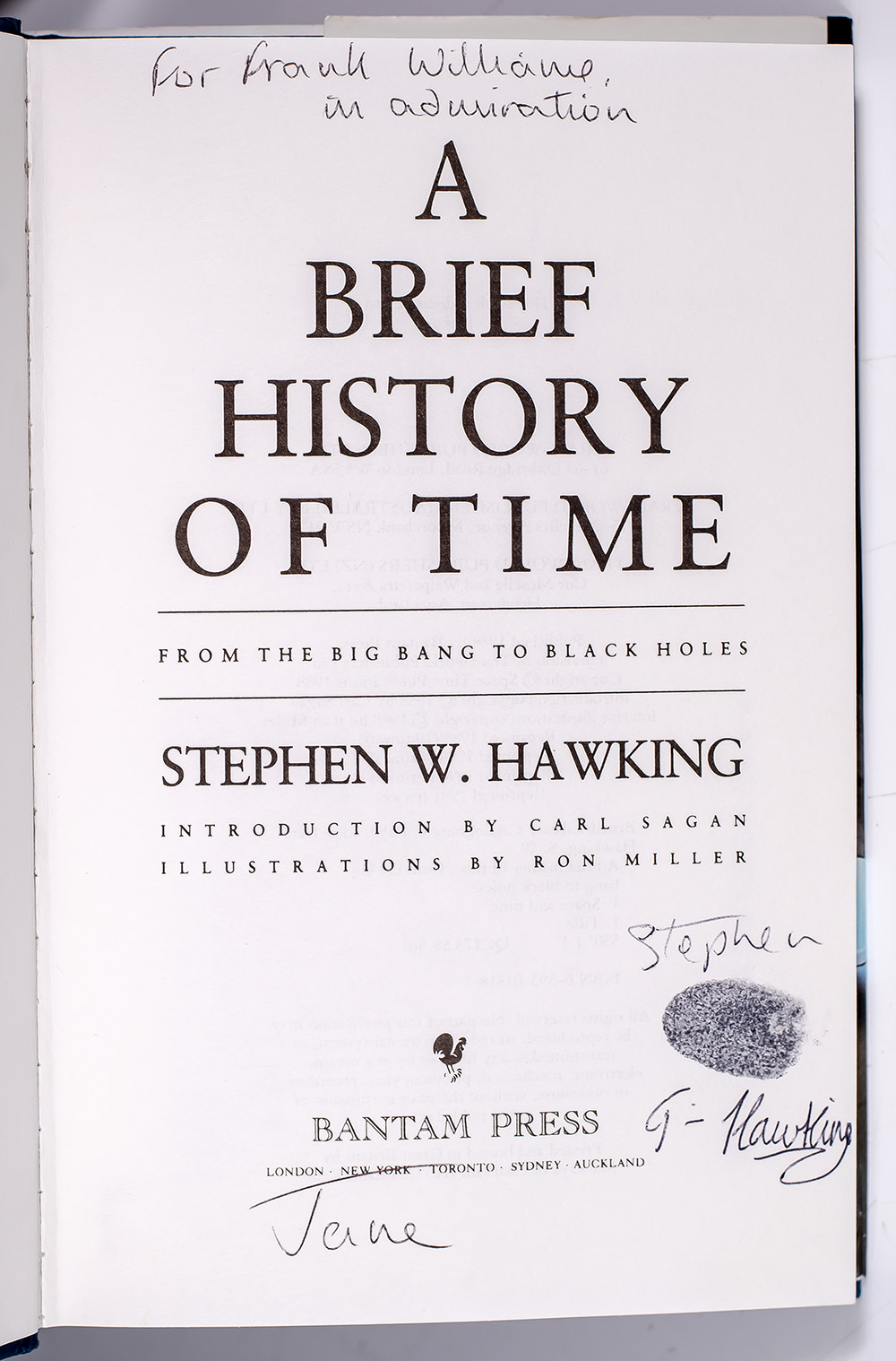 Rare association copy of STEPHEN HAWKING'S LANDMARK WORK A BRIEF HISTORY OF TIME; signed by Stephen Hawking with his thumbprint and signed by his wife Jane Hawking