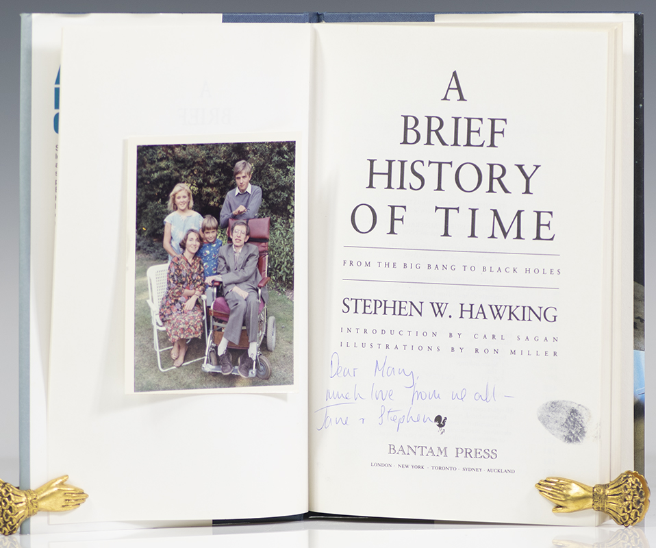 Early printing of Hawking’s groundbreaking work. Octavo, original cloth, illustrated by Ron Miller. Presentation copy, signed by Stephen Hawking on the title page with his thumbprint and inscribed by his wife, Jane Hawking, "Dear Mary, much love from us all - Jane & Stephen." With an original color photograph of Stephen and Jane Hawking with their children tipped onto the opposite page. Fine in a fine dust jacket. Author photograph by David Gamble. Rare and desirable signed by Stephen and Jane Hawking.