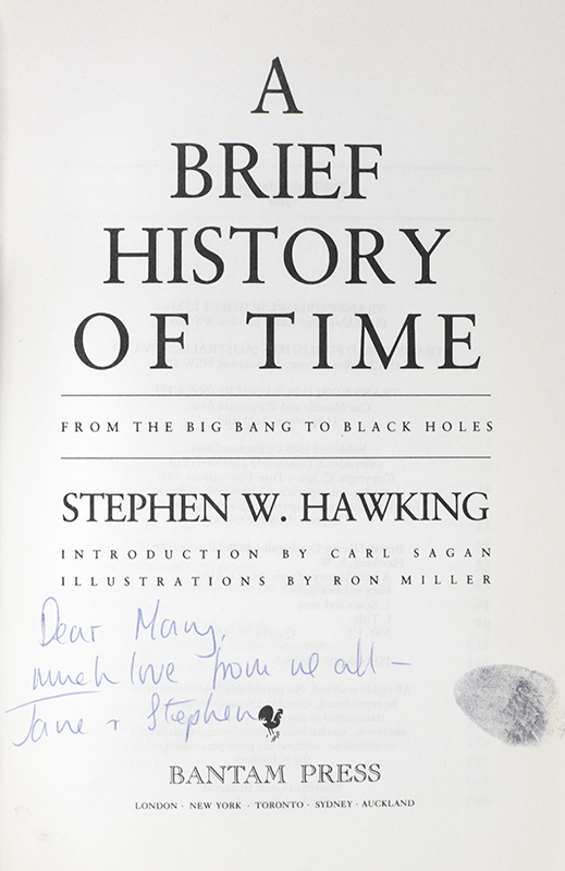 STEPHEN HAWKING'S LANDMARK WORK A BRIEF HISTORY OF TIME; Signed by Stephen Hawking and Inscribed by his Wife Jane Hawking