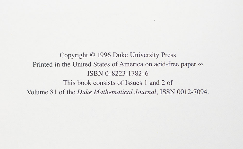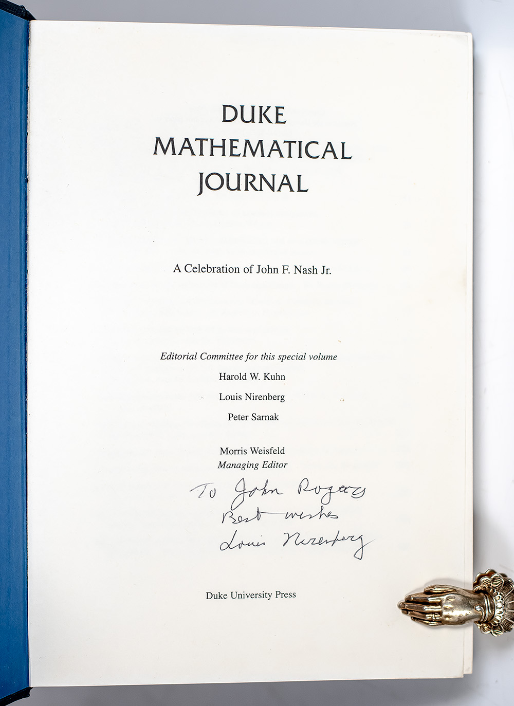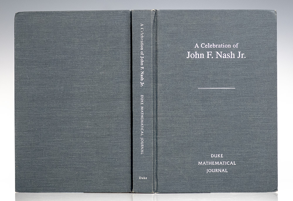 First edition of this collection of Nash's writings. Octavo, original blue cloth. Presentation copy, inscribed by the mathematician on the title page, "To John Rogay Best wishes Louis Nirenberg." In near fine condition. Edited by Harold W. Kuhn, Louis Nirenberg and Peter Sarnak. Managing editor Morris Weisfeld. Louis Nirenberg was considered one of the most outstanding mathematicians of the 20th century.