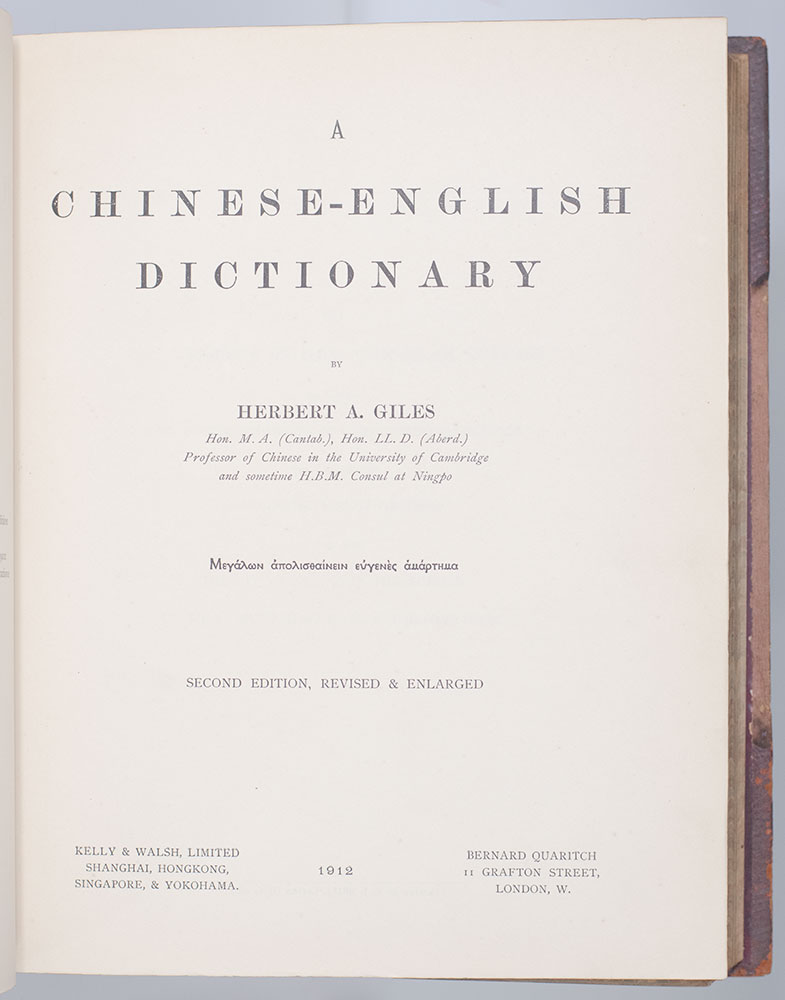 Finley bound second revised and enlarged edition of Giles' monumental work, the first Chinese–English encyclopedic dictionary published. Quarto, bound in three quarters morocco, gilt titles and tooling to the spine, rebacked, all edges marbled. The present enlarged edition contains the original 13,848 Chinese character head entries alphabetically collated by Beijing Mandarin pronunciation romanized in the Wade–Giles system with the addition of 67 entries and numerous usage examples. In very good condition. Exceptionally clean internally. A nice example of the most complete Chinese-English dictionary ever published.