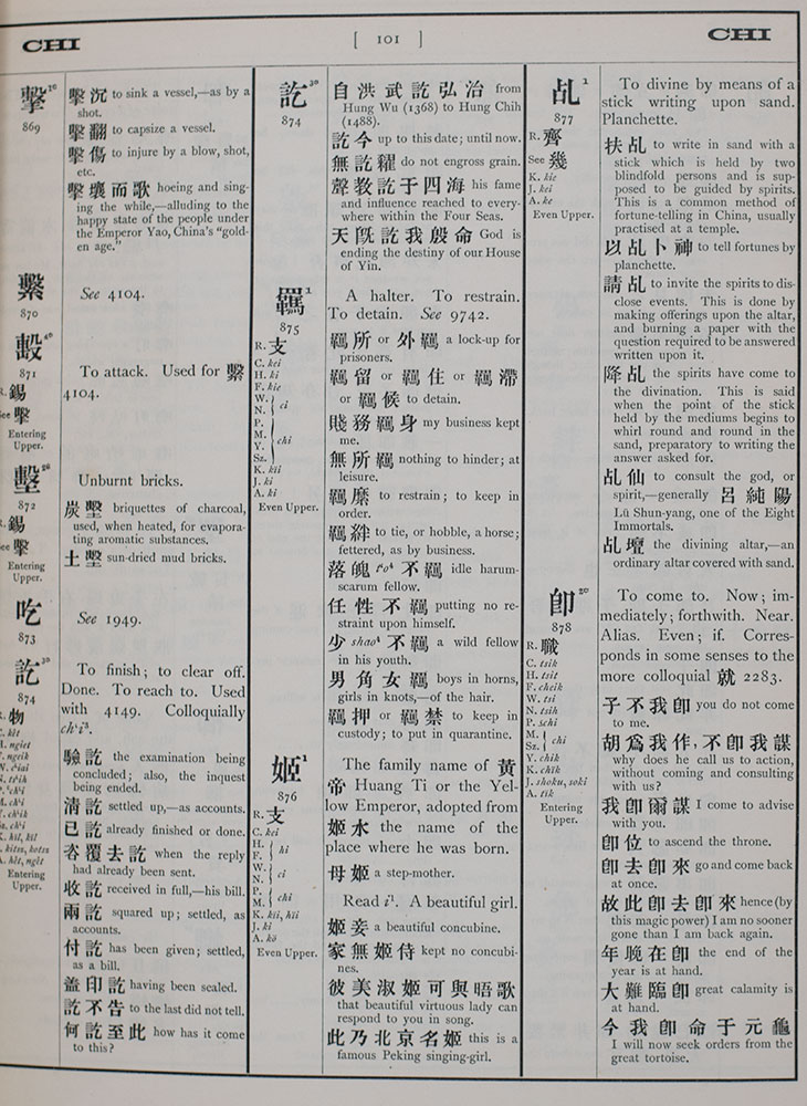 Herbert Giles worked for 18 years to compile and publish the 1892 first edition A Chinese-English Dictionary, which contains 10,859 character head entries plus 2,989 variant characters for a total of 13,848 entries. He decided to number every head entry—an improvement lacking in the earlier dictionaries of Morrison, Medhurst, and Williams—in order to facilitate internal cross-referencing and make it easier for users to find characters. Giles subsequently worked for 20 years revising and adding "a vast number of compounds and phrases" to the 1912 second edition, which contains 10,926 head entries (67 more) plus 2,922 variants, also totaling 13,848.