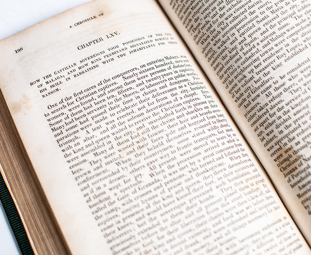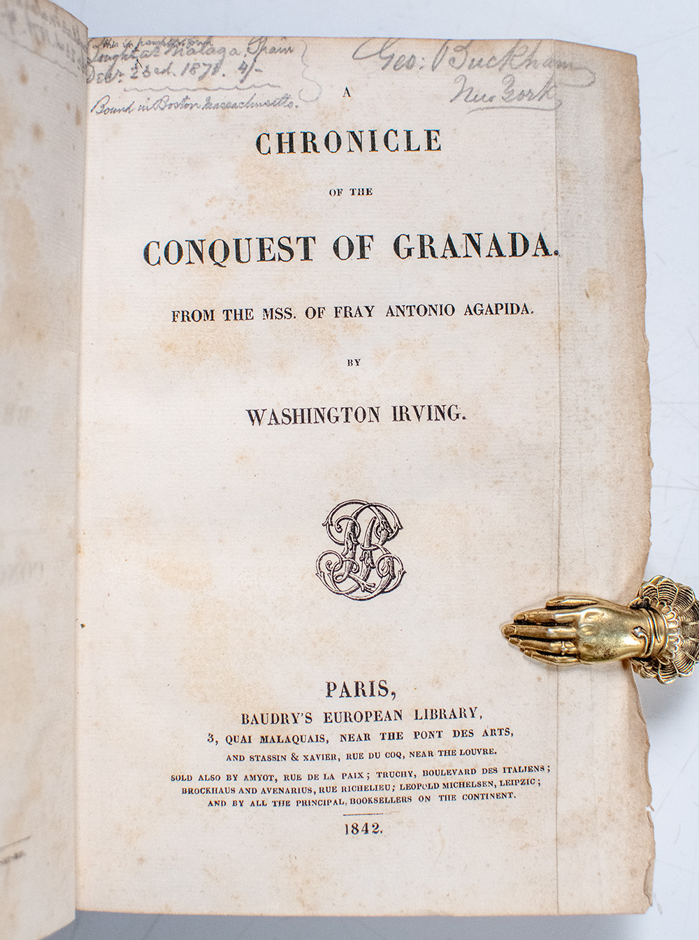 General William T. Sherman's copy of this romanticized historical narrative. Octavo, bound in full dark green calf with gilt titles to the spine in six compartments within raised gilt bands, all edges gilt, turn-ins and inner dentelles, marbled endpapers. Full page autograph inscription in pencil by United States General William T. Sherman on the verso of the title page and signed by him. The inscription reads in full, "Granada. January 2, 1872. On reaching Granada three days ago, I met Mr Buckham of New York and on enquiring for a copy of Irving's Conquest of Granada he kindly lent me this. I have partially ... it and have found it intensely interesting for the association-but am the more obliged to Mr Buckham for his kindness in loaning me this book at this time. I hope I may have it in my person to reciprocate the favor at some future occasion. W.T. Sherman General US Army." William Tecumseh Sherman was a Union general during the American Civil War, best known for his decisive leadership and his implementation of "total war" strategies. Born in 1820, Sherman graduated from West Point and served in various military roles before rising to prominence in the Civil War. His encounter with Granada, most notably through his 1872 visit to southern Spain during his post–Civil War travels in Europe, reveals a lesser-known dimension of the American general often remembered solely for his military campaigns. Sherman’s reflections on Granada’s Alhambra, recorded in his travel letters and memoirs, show his deep admiration for the city’s layered Islamic, Jewish, and Christian histories and for the architectural splendor of the Nasrid palace complex. In very good condition with some rubbing to the panels, bookplates to the front pastedown.