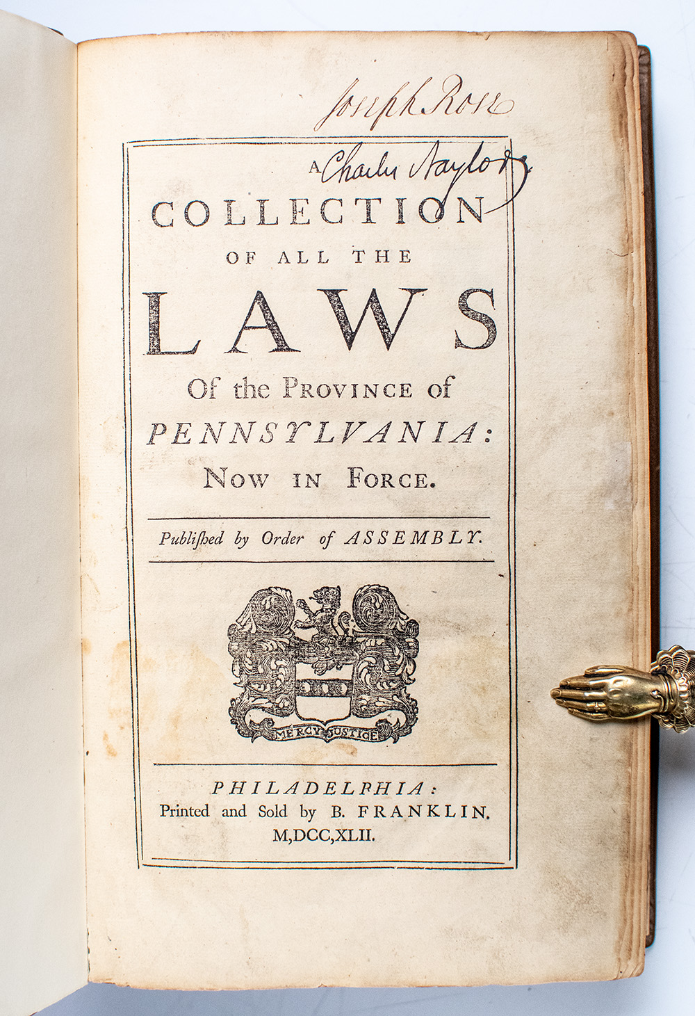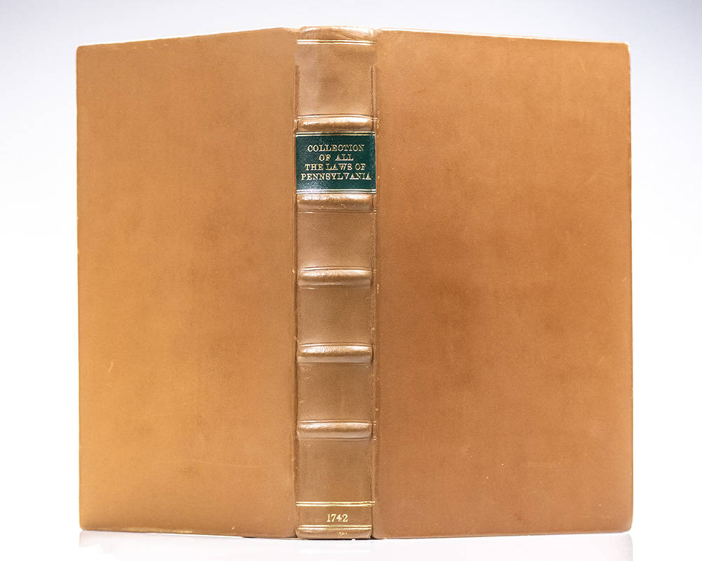 First edition of Benjamin Franklin's printing of the laws of colonial Pennsylvania. Folio, bound in full modern brown calf with green morocco label in gilt, marbled endpapers. Agitation for a complete and correct edition of the laws of Pennsylvania began in 1737, and in early 1739, John Kinsey, the Attorney General of the province, was appointed to supervise the project. Franklin received Kinsey's revised copy in the spring of 1741 and completed the printing two years later. In very good condition with toning and annotations to the final index. Ownership signatures to the title page of Joseph Ross and Charles Taylor. Uncommon.