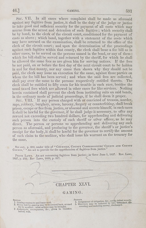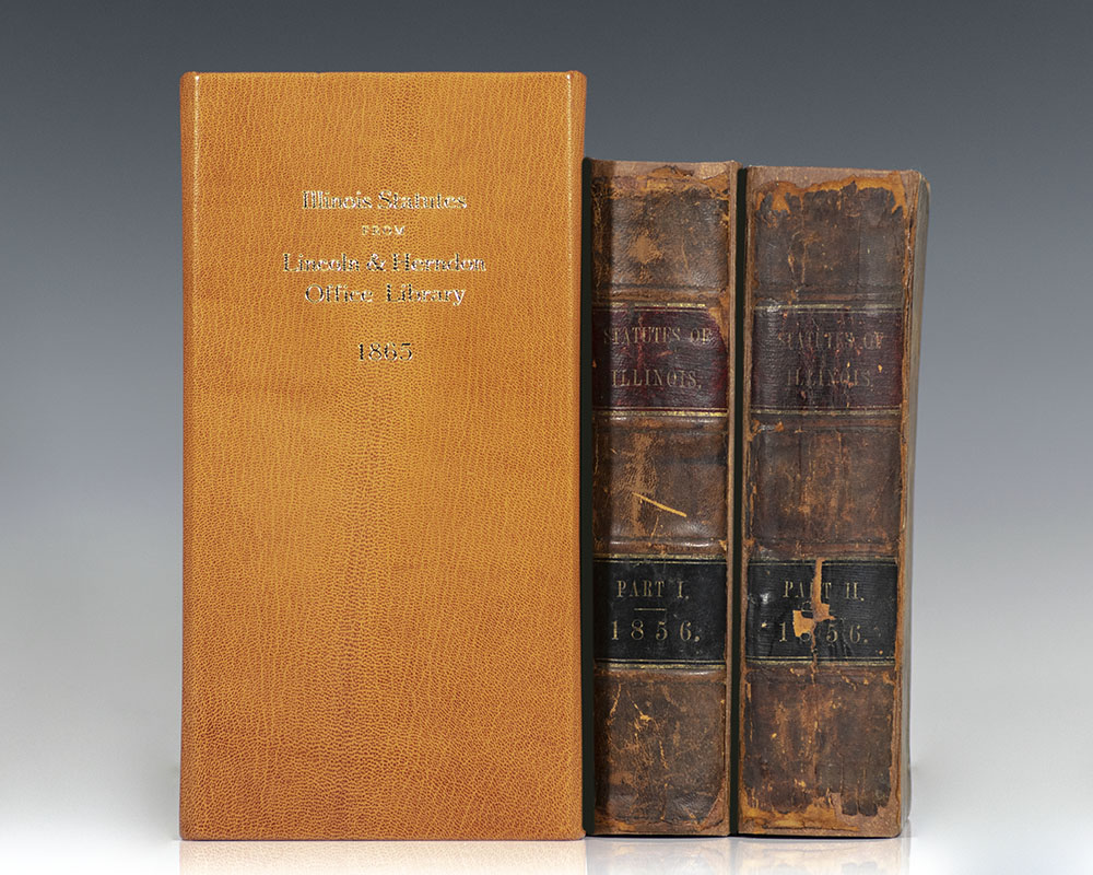 First edition of Purple's Statutes from the law library of Abraham Lincoln and William Herndon. Large octavo, 2 volumes, bound in full contemporary calf with morocco spine labels lettered in gilt. With Herndon's ownership signature on behalf of the firm to the front pastedown of Vol. I, "A. Lincoln W. Herndon Lincoln & Herndon Springfield" and Vol. II, "Lincoln-Herndon." Additionally with what are likely Lincoln's scribbles to several pages including page 531 and 590-591. Lincoln was known to doodle in squiggly lines in his books and papers; in 2006 David Greenberg published Presidential Doodles: Two Centuries of Scribbles, entirely devoted to the subject. In very good condition, lacking the title pages and with restoration and repairs to several pages. Housed in a custom half morocco clamshell box. Rare and desirable.