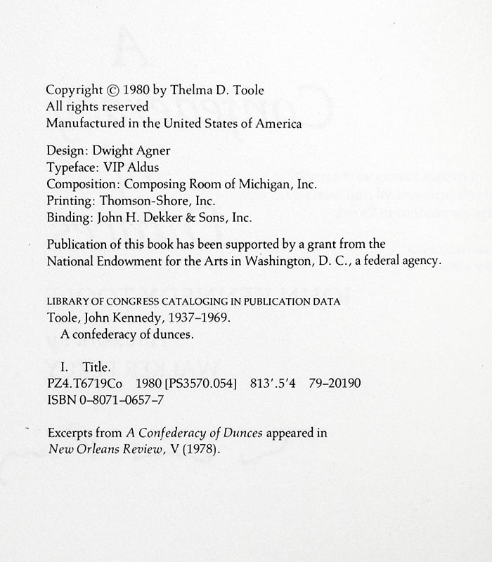 First Edition of John Kennedy Toole's Pulitzer Prize-winning novel A Confederacy of Dunces; Signed by Walker Percy