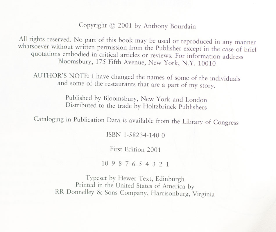 First edition of this written record of Bourdain's travels around the world in his search for the perfect meal. Octavo, original boards. Boldly inscribed by Anthony Bourdain on the title page who has added a drawing of a skull in a chef hat with a large butcher knife in its mouth, "Cook Rule! To Erica, Anthony Bourdain." Fine in a fine dust jacket. Jacket design by High Design.