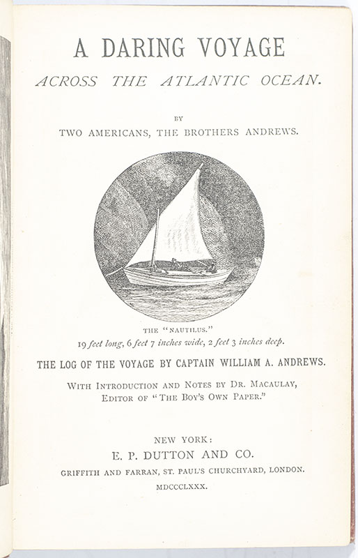 First edition of this work regarding the crossing of the Atlantic, which the Andrews brothers sailed from Boston to England and then to France in a 20 foot Gloucester dory. Octavo, original gilt decorated cloth, with 12 illustrations. With Introduction and Notes by Dr. Macaulay. From the library of James Stephen “Steve” Fossett with his bookplate to the front free endpaper. American businessman and record-setting aviator Steve Fossett became the first person to fly solo nonstop around the world in 2002 in his 10-story high balloon Spirit of Freedom. He completed the 2002 trip in 13 days, 8 hours, and 33 minutes and set records for both the Longest Distance Flown Solo in a Balloon and Fastest Balloon Flight Around the World. Fossett was also one of sailing’s most prolific distance record holders set the Absolute World Speed Record for airships with a Zeppelin NT in 2004. He received numerous awards and honors throughout his career including aviation’s highest award, the Gold Medal of the Fédération Aéronautique Internationale (FAI), which he was awarded in 2002. Fossett disappeared on September 3, 2007 while flying a light aircraft over the Great Basin Desert, between Nevada and California. In very good condition. Uncommon.