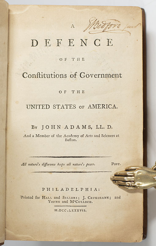 “A Constitution of Government once changed from Freedom, can never be restored. Liberty, once lost, is lost forever”: First American Edition of John Adams's A Defence of the Constitutions of Government of the United States of America; from the library of American founding father Gunning Bedford, Jr.