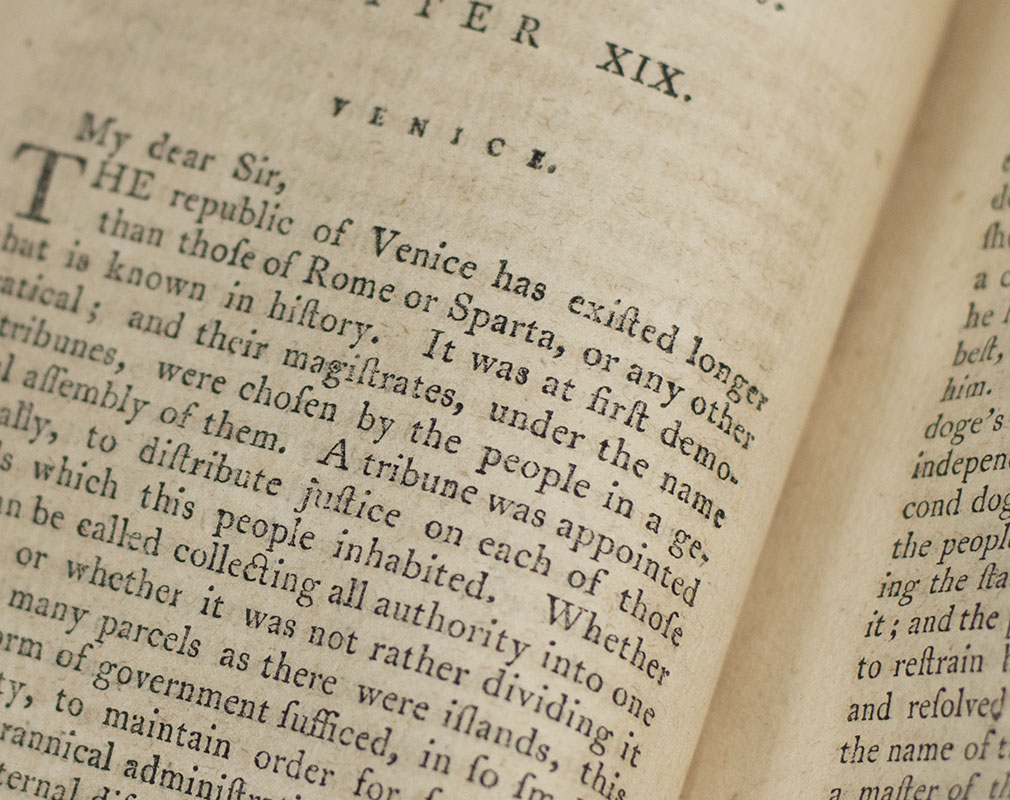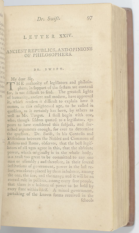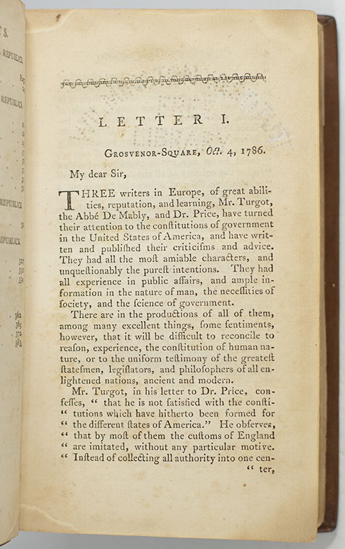 Adams wrote this work on constitutional theory while serving as Minister to the Court of St. James as a response to liberal French statesman Turgot, who had criticized the new American state constitutions for their conservative economic framework. Adams's Defence was often cited in the debates of the Constitutional Convention. "A work marked by insight, breadth of views, conviction, courage, and—we may venture to add—much wisdom" (Larned, Literature of American History 2287). At the start of 1787, while minister to Great Britain and a year before he returned to America, John Adams "felt an urgency like that of 1776. Great events were taking place at home. Support for a stronger central government was gaining ground… A constitutional convention was in the offing, and as he had been impelled in 1776 to write his Thoughts on Government, so Adams plunged ahead… books piled about him, his pen scratching away until all hours… By early January 1787, Adams had rushed the first installment of his effort to a London printer. Titled A Defence of the Constitutions of Government of the United States of America… copies were sent off at once to the United States and to Jefferson in Paris" (McCullough, John Adams, 374). Of the Defence, Thomas Jefferson wrote to Adams, "I have read your book with infinite satisfaction and improvement. It will do great good in America. Its learning and its good sense will, I hope, make it an institute for our politicians, old as well as young" (Sowerby, 3004). "From Philadelphia, where the Constitutional Convention had assembled, Benjamin Rush, a member of the Convention, wrote that the Defence had 'diffused such excellent principles among us, that there is little doubt of our adopting a vigorous and compound federal legislature… To a considerable extent, Adams' Defence was an expanded, more erudite rendition of the case for checks and balances in government that he had championed in his Thoughts on Government (1776), and later put into operation in his draft of the Massachusetts constitution" (McCullough, 375). "The work did much to familiarize the European mind to the novel state of things then taking place in America" (Sabin 236). This volume was issued as a stand-alone work, and was followed by two supplemental volumes the following year (Sabin, 234).