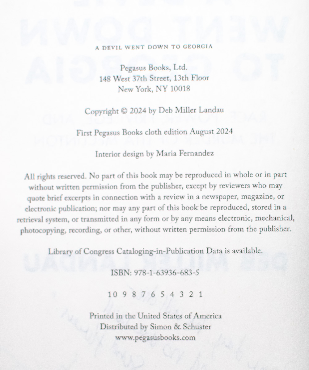 "One day, he will die - and no one will send flowers": First Edition of A Devil Went Down to Georgia; lengthily signed by Deb Miller Landau
