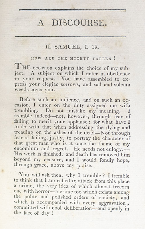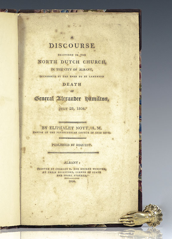 “The most popular sermon on Hamilton’s death": First edition of Eliphalet Nott's A Discourse Delivered in the North Dutch Church in the City of Albany, Occasioned by the Ever to be Lamented Death of General Alexander Hamilton, July 29, 1804