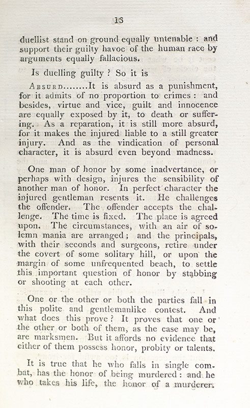 “Nothing in the volume [i.e. Coleman’s Collection of Facts and Documents] is so justly famous, however, as the remarkable memorial address delivered in Albany by Eliphalet Nott, then a clergyman of but thirty-one years of age, and destined to assume, in that very year, the presidency of Union College. This oration, by reason of its moving eloquence and the courage with which it attacked the institution of dueling, gave its author immediately a national reputation. For fifty years after its delivery, few examples of pulpit oratory were more frequently drawn upon in extracts for the use of school Readers and Speakers” (Ford 101).