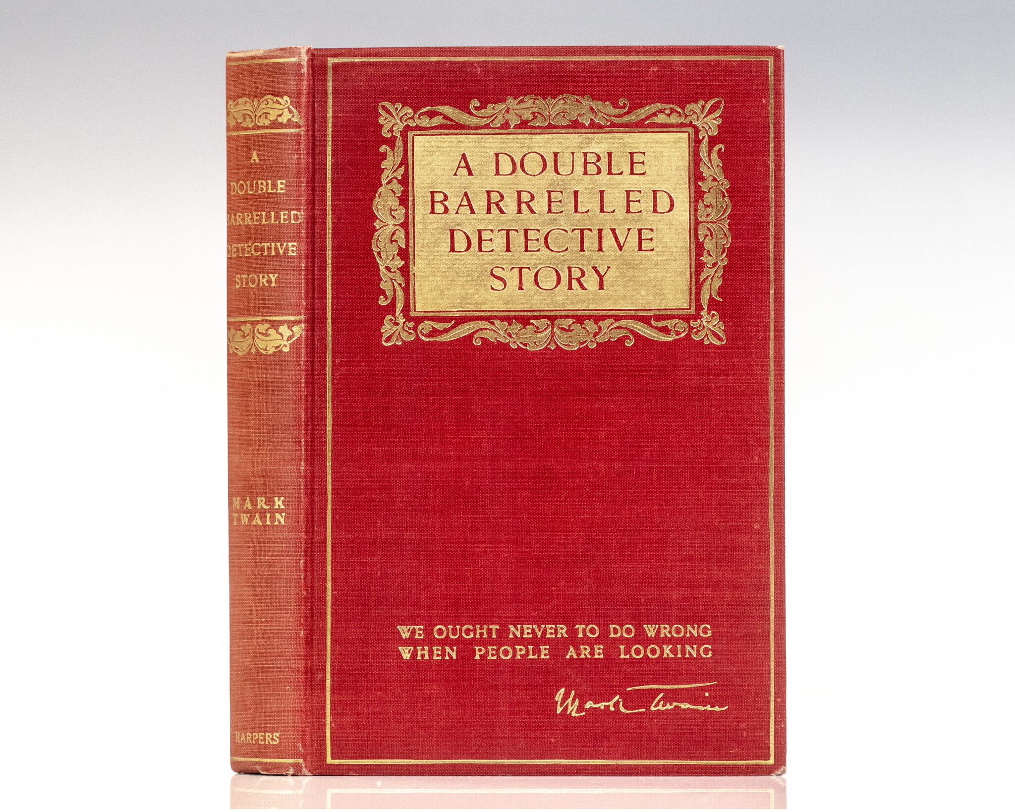 First edition of Twain's playful parody of Sherlock Holmes. Octavo, original publisher's red cloth lettered and stamped in gilt, pictorial endpapers, tissue-guarded frontispiece, illustrated by Lucius Hitchcock. BAL 3471. In near fine condition, top edge gilt.