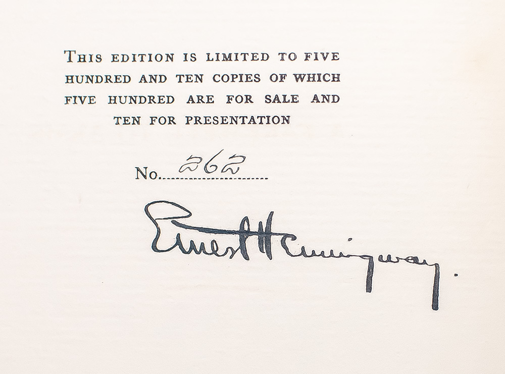 Signed limited first edition of this early Hemingway classic, which established him among the American masters. Tall octavo, bound in full black morocco by Zaehnsdorf for Asprey, gilt titles and elaborate tooling to the spine, raised bands, elaborate gilt tooling to the front and rear panels, all edges gilt, inner dentelles, silk endpapers. One of 510 copies signed by Ernest Hemingway. In fine condition. Housed in a custom slipcase. An exceptional example, rare and desirable.