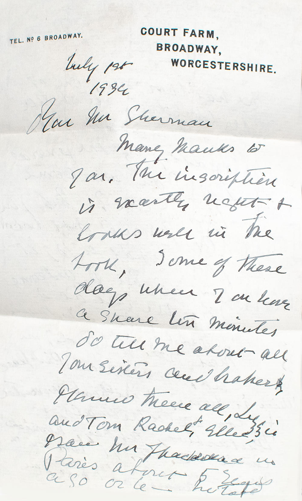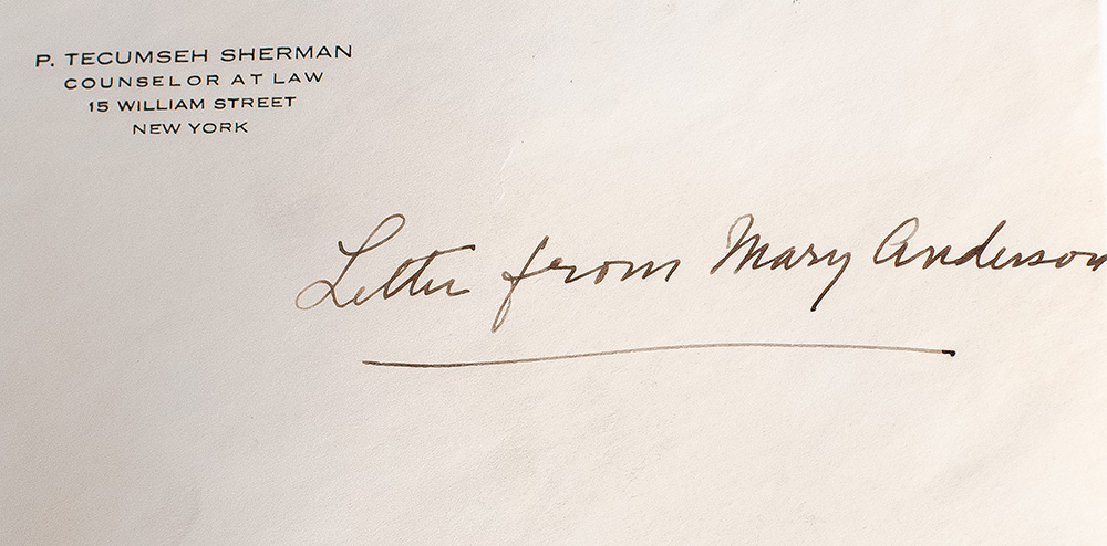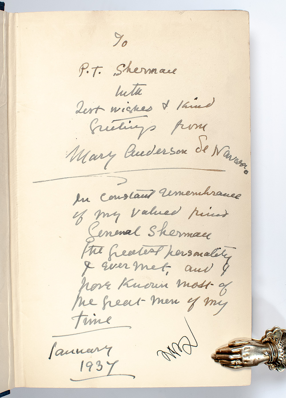 First edition of this autobiography of an actress; from the library of Philemon Tecumseh Sherman. Octavo, original blue cloth, frontispiece portrait of Mary Anderson de Navarro, illustrated with seventeen black and white photographs. Presentation copy, lengthily inscribed by the author to P. T. Sherman, "To P.T. Sherman with best wishes & kind greetings from Mary Anderson de Navarro In constant remembrance of my valued friend General Sherman the greatest personality I ever met, and I have known most of the great men of my time January 1937." Accompanied by an autograph letter signed from the author to Mr. Sherman thanking him for an inscription in a book, two pages on Tel. No. 6 Broadway stationary. In very good condition with light rubbing. General William Tecumseh Sherman’s son P. T. Sherman was a lawyer in New York, specializing in labor and insurance, and was elected a member of the New York Board of Alderman in the late 1880s. In the early 1900s, he was appointed the New York Commissioner of Labor. He transferred his library to his niece, Eleanor Sherman Fitch, the granddaughter of General Sherman through his eldest daughter, Maria “Minnie” Ewing Sherman Fitch, before he died. Until now, the book was held at the family estate in Washington County, Pennsylvania.