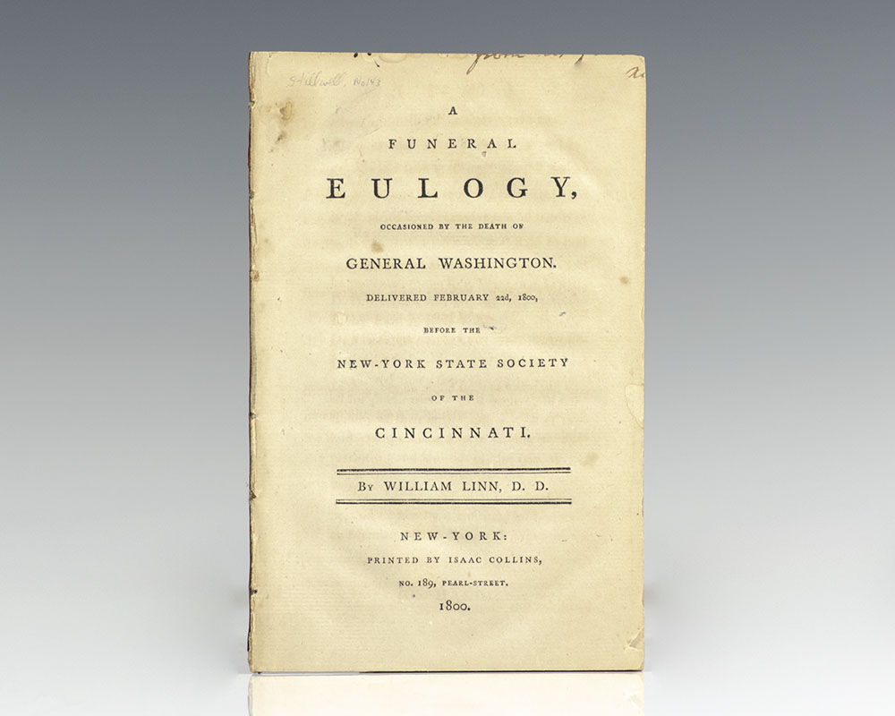 "Already has every American wept; already have the sad funeral processions moved; and already have the virtues and the services of Washington been celebrated from the pulpit": Rare first edition of William Linn's A Funeral Eulogy, Occasioned by the Death of General Washington