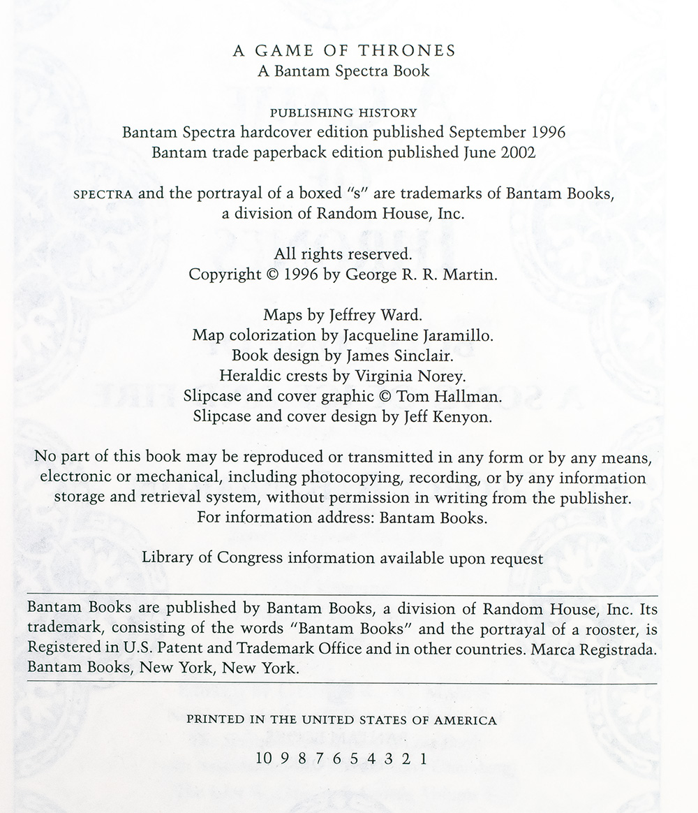 First deluxe edition of the first book in George R.R. Martin’s acclaimed A Song of Ice and Fire series. Octavo, original publisher's gilt-decorated cloth, cartographic endpapers, ribbon bound in. Near fine in the original publisher's slipcase which is in fine condition.