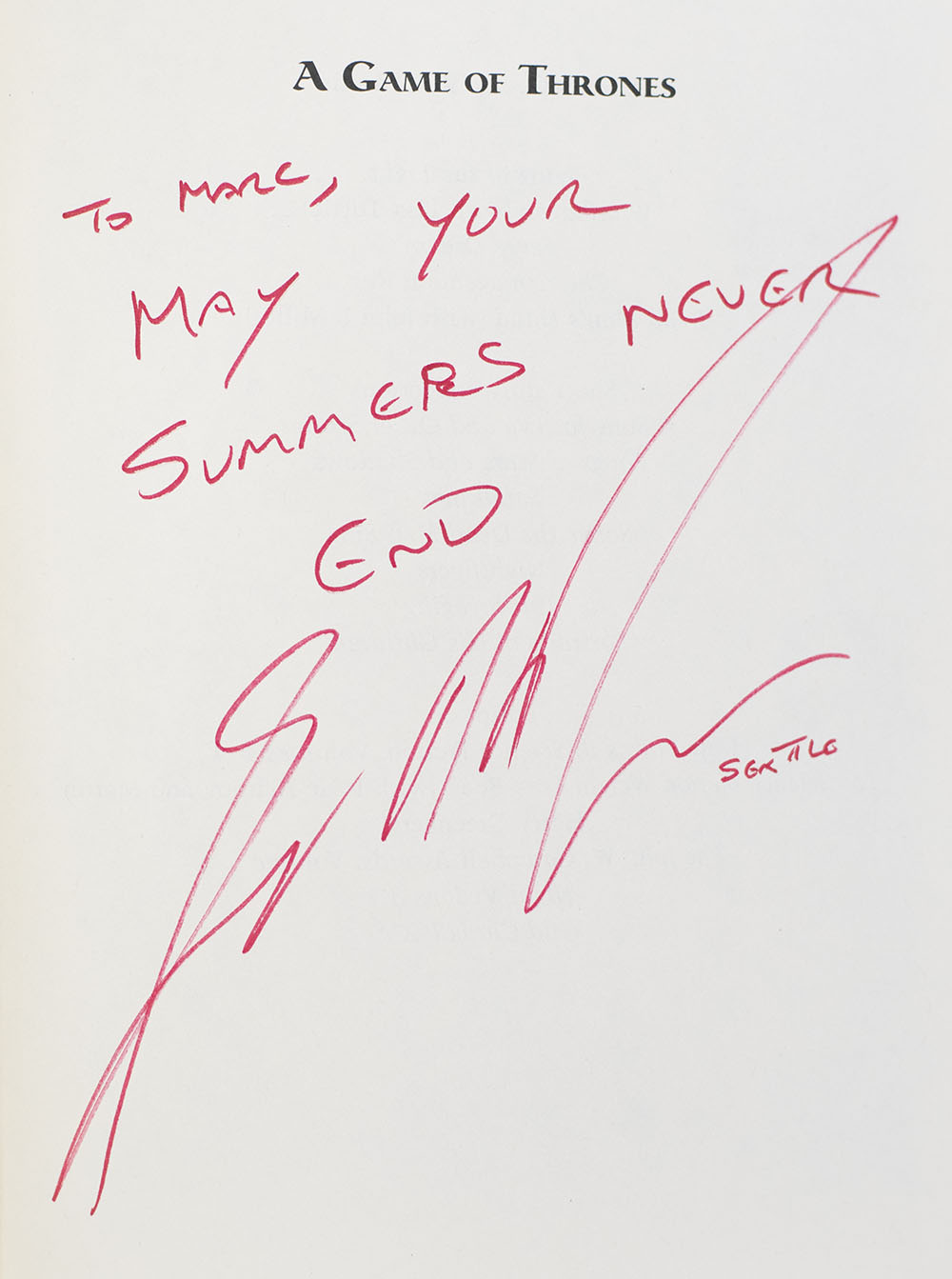 First edition of the first book in the author's acclaimed Game of Thrones series. Octavo, original half cloth, cartographic endpapers. Presentation copy, warmly inscribed by the author on the half-title page, "To Marc, May your summers never end. George R.R. Martin Seattle." Fine in a near fine dust jacket. Jacket illustration by Tom Hallman. Book design by James Sinclair.