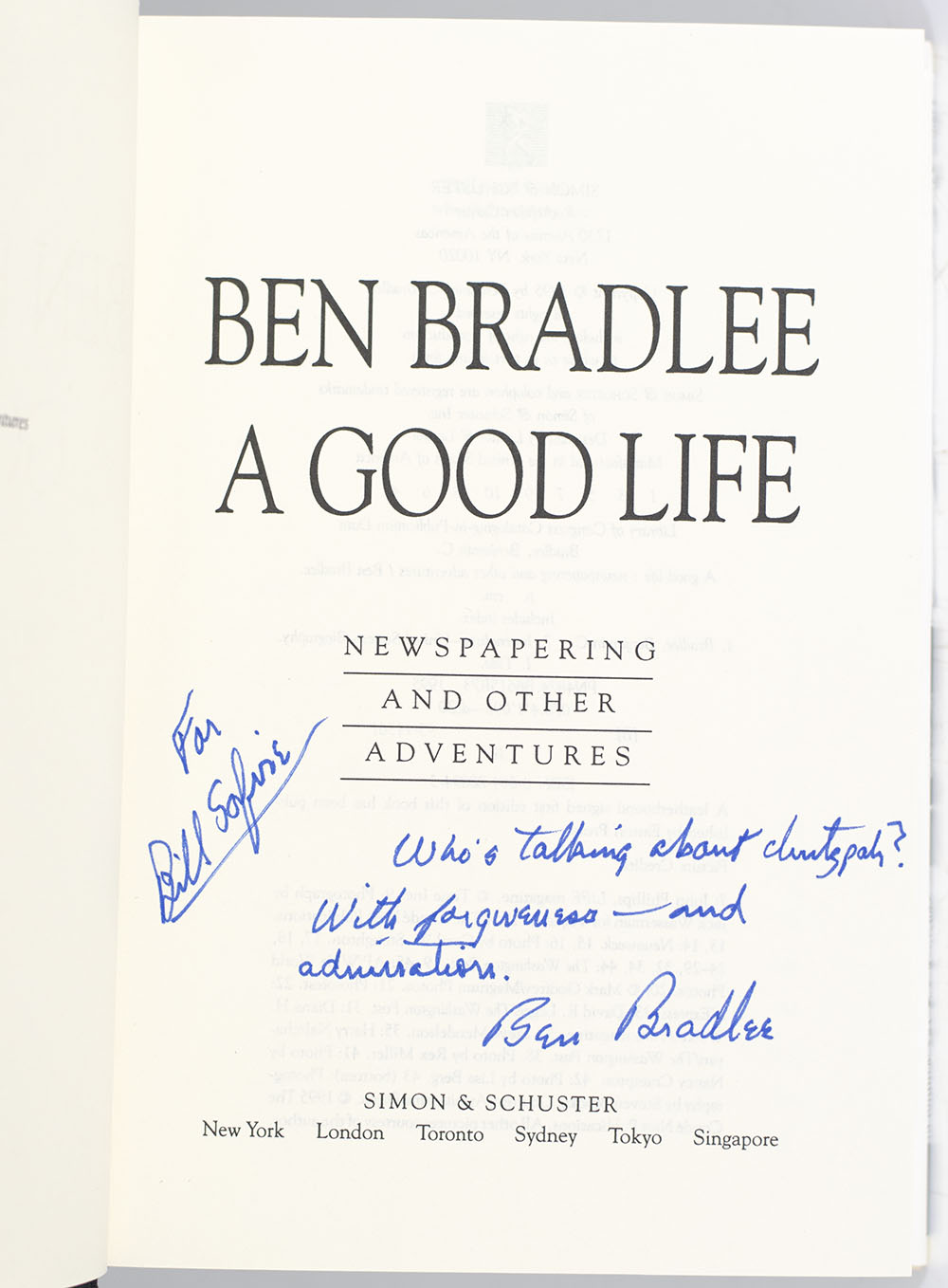 First edition of Ben Bradlee's A Good Life; inscribed by him to American Journalist William Safire