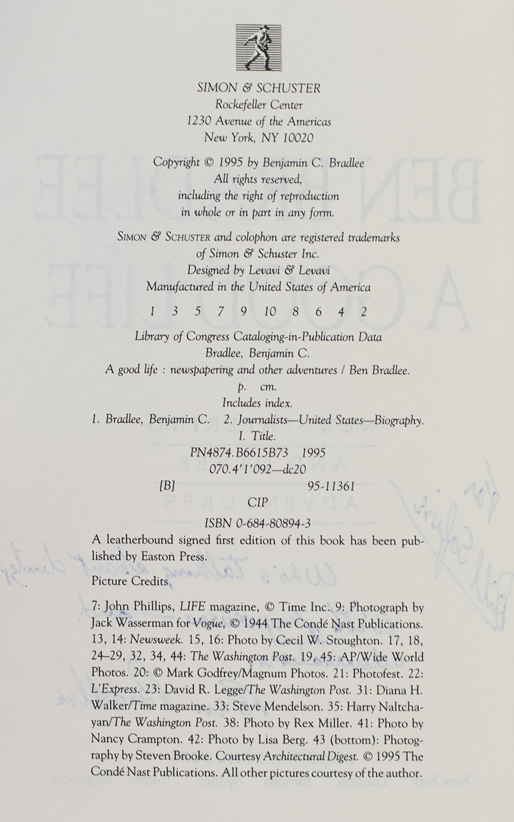 First edition of this classic New York Times bestselling memoir by legendary Executive Editor of The Washington Post. Octavo, original half cloth, illustrated. Association copy, inscribed by the author on the front free endpaper, "For Bill Safire Who's talking about chutzpah? With forgiveness - and admiration. Ben Bradlee." The recipient, William Safire was an important American author, columnist, journalist, and presidential speechwriter. He joined Nixon’s campaign for the 1960 Presidential race, and again in 1968. After Nixon’s 1968 victory, Safire served as a speechwriter for him and Spiro Agnew. He authored several political columns in addition to his weekly column “On Language” in The New York Times Magazine from 1979 until the month of his death and authored two books on grammar and linguistics: The New Language of Politics (1968) and what Zimmer called Safire’s “magnum opus,” Safire’s Political Dictionary. Safire later served as a member of the Pulitzer Prize Board from 1995 to 2004 and in 2006 was awarded the Presidential Medal of Freedom by President George W. Bush. With three typed letter signed by Bradlee addressed to Safire and a copy of Safire's review of the book tipped in. Fine in a fine dust jacket. Jacket design by Lawrence Ratzkin. Jacket photograph by Bill O'Leary. A unique association copy, Safire was considered an odd choice for a book reviewer to review the present volume, as "...Safire was Richard Nixon's flack and ghost for four years. Bradlee's glory is that he brought Richard Nixon down" (Mary McGory, The Washington Post).