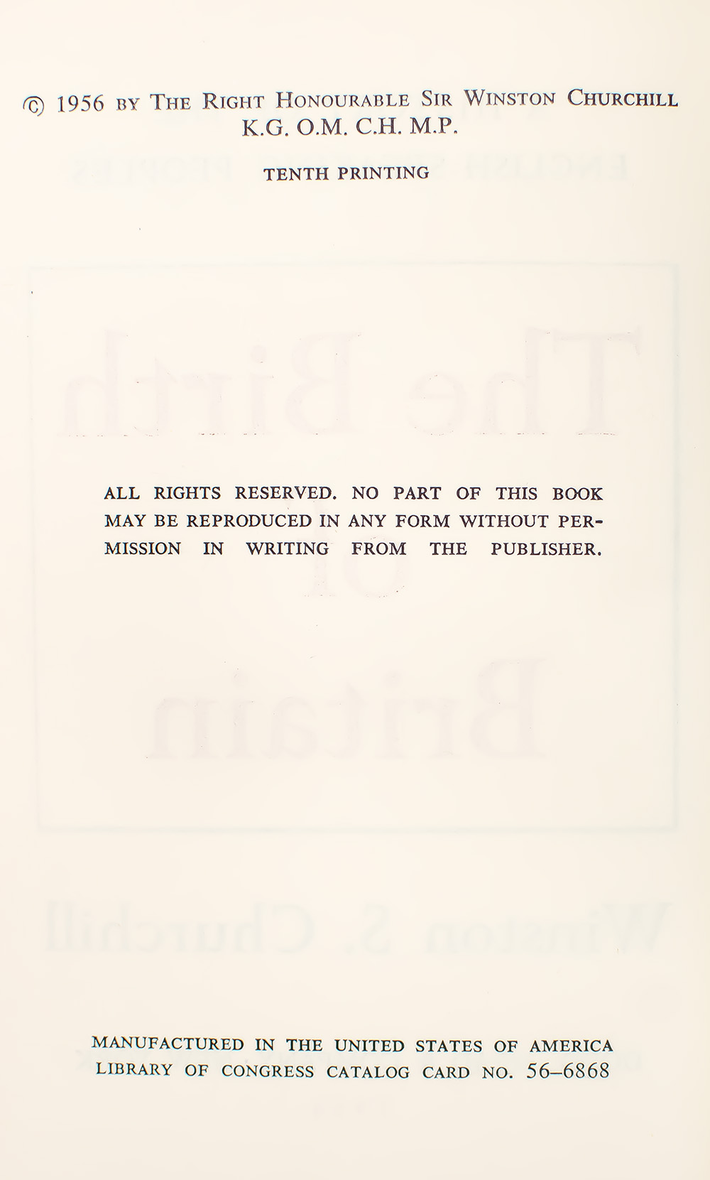 "Churchill’s last great work was published nearly 20 years after he penned its first draft in the late 1930s, just after wrapping up [the biography of] Marlborough. This enabled him to utilize the literary team he had assembled for the biography, to which he added dozens of outlines he had solicited from scholars In its final form the original single volume evolved to four, each of which was published simultaneously in Britain, the USA and Canada— a first for Churchill’s works" (Langworth, 312).