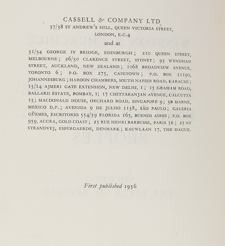 "Churchills last great work was published nearly 20 years after he penned its first draft in the late 1930s, just after wrapping up [the biography of] Marlborough. This enabled him to utilize the literary team he had assembled for the biography, to which he added dozens of outlines he had solicited from scholars In its final form the original single volume evolved to four, each of which was published simultaneously in Britain, the USA and Canada a first for Churchills works" (Langworth, 312).