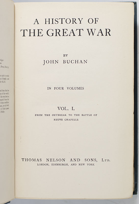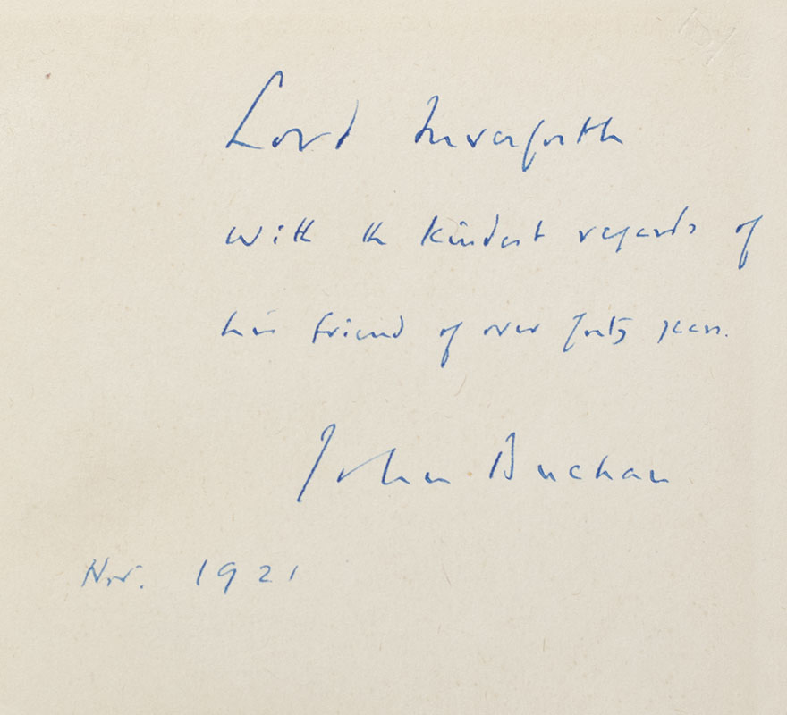 First edition of Buchan's classic work. Octavo, original cloth. Association copy, inscribed by the author in the year of publication on the front free endpaper, "Lord Inverforth with the kindest regards his friend of over forty years John Buchan Nov. 1921." The recipient, Andrew Weir, 1st Baron Inverforth was a close friend of Buchan's. Both Scotsmen received military appointments in the First World War. Inverforth, the founder of a prominent shipbuilding firm in Glasgow, served as Surveyor General of Supplies from 1917–1919 and Minister of Munitions from 1919–1921. During the war, Buchan was sent out to the Western Front to be attached to the British Army's General Headquarters Intelligence Section, to assist with drafting official communiques for the press. On arrival he received a field-commission as a second lieutenant in the Intelligence Corps and in 1917, was appointed Director of Information under Lord Beaverbrook. In near fine condition. Housed in a custom slipcase. Rare and desirable signed.