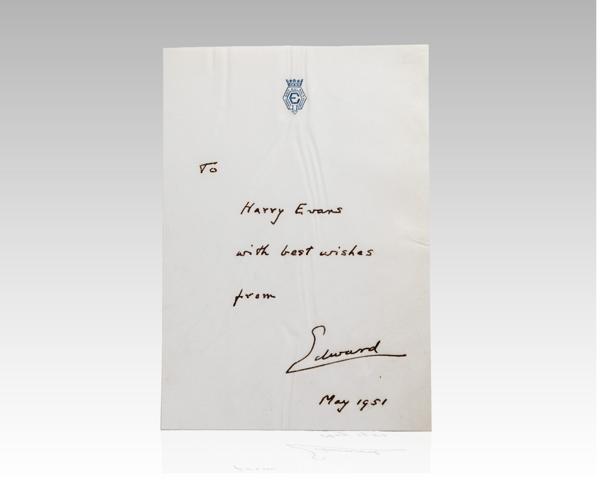 First edition of A King's Story, King Edward's classic autobiography. Octavo, original publisher's cloth with coat of arms stamped in gilt to the front panel, top stain red, cartographic endpapers, frontispiece, illustrated with black and white photographs. Inscribed note by the Duke of Windsor on his official monogrammed stationary laid in, "To Harry Evans with best wishes from Edward." Very good in a good dust jacket with a slight lean to the text block, and chipping to the dust jacket with losses to the flap hinges. Together with a first edition of The Heart Has Its Reasons, the autobiography of Wallis Simpson. Octavo, original publisher's half-cloth, top stain green, illustrated with 32 pages of black and white photographs. Signed by the Duchess of Windsor on the half-title page, "With love and admiration from Wallis." Near fine in a good dust jacket with chipping, creasing, losses to the spine, and tape repairs to the verso. Desirable.