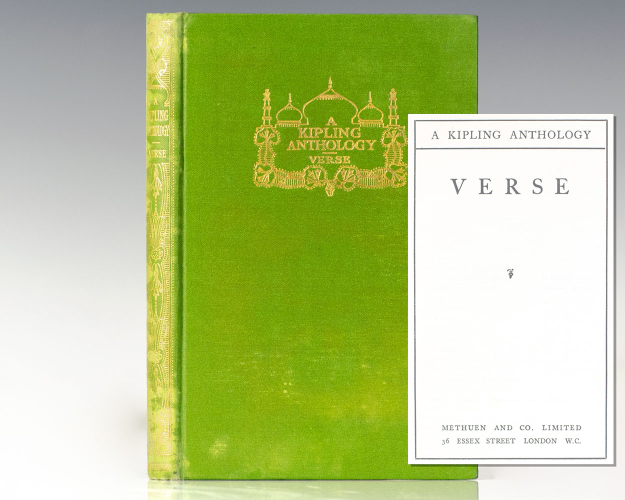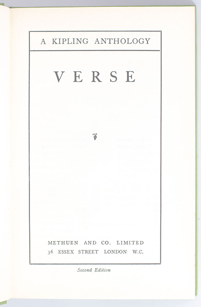 Second edition of this anthology of Kipling's verse, published the same year as the first. Octavo, original cloth decorated in gilt, top edge gilt. Contains an abridged version of Kipling's famed poem If-. In near fine condition. Period secondary school bookplate to the pastedown. A charming example.