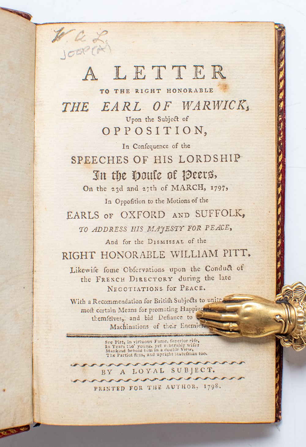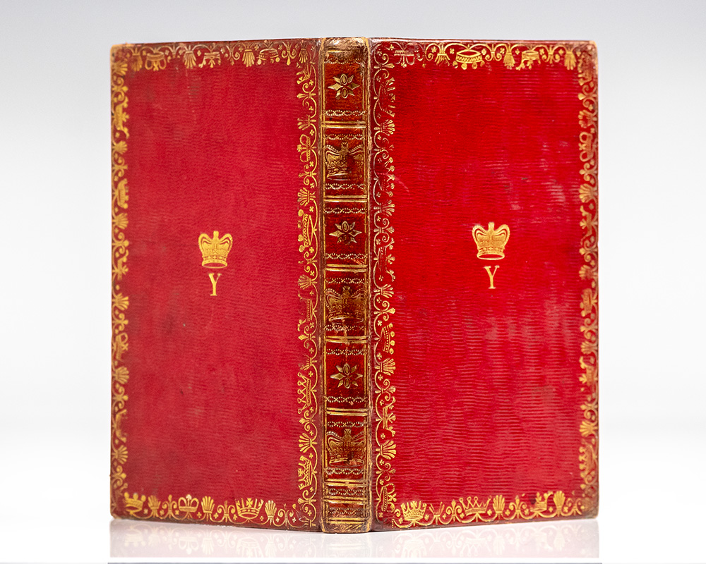 First edition of this appeal to the King of Great Britain and Ireland, King George III, during the French Revolutionary Wars. Duodecimo, bound in full contemporary straight-grain red morocco with elaborate gilt tooling to the spine in six compartments, elaborate gilt ruling with a gilt coronet and monogram 'Y' to the front and rear panels, all edges gilt, gilt inner dentelles, and marbled endpapers. In very good condition, plate to the front pastedown in red morocco and gilt of "Ex Libris W. A. Foyle, Beeleigh Abbey" and an ownership stamp to the verso of the title page "Alexander Gardyne 1883." Rare.