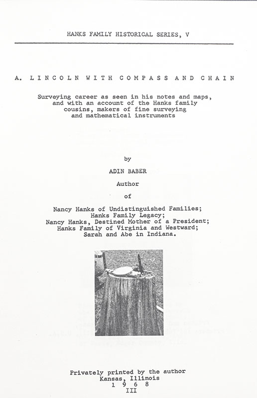 A. Lincoln with Compass and Chain: Surveying Career as Seen in His Notes and Maps, and with an Account of the Hanks family Cousins, Makers of Fine Surveying and Mathematical Instruments.