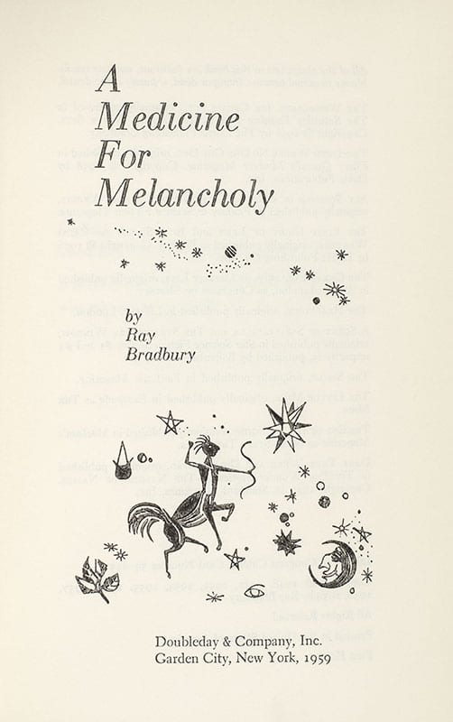 First Edition of Ray Bradbury's A Medicine for Melancholy; lengthily inscribed by him