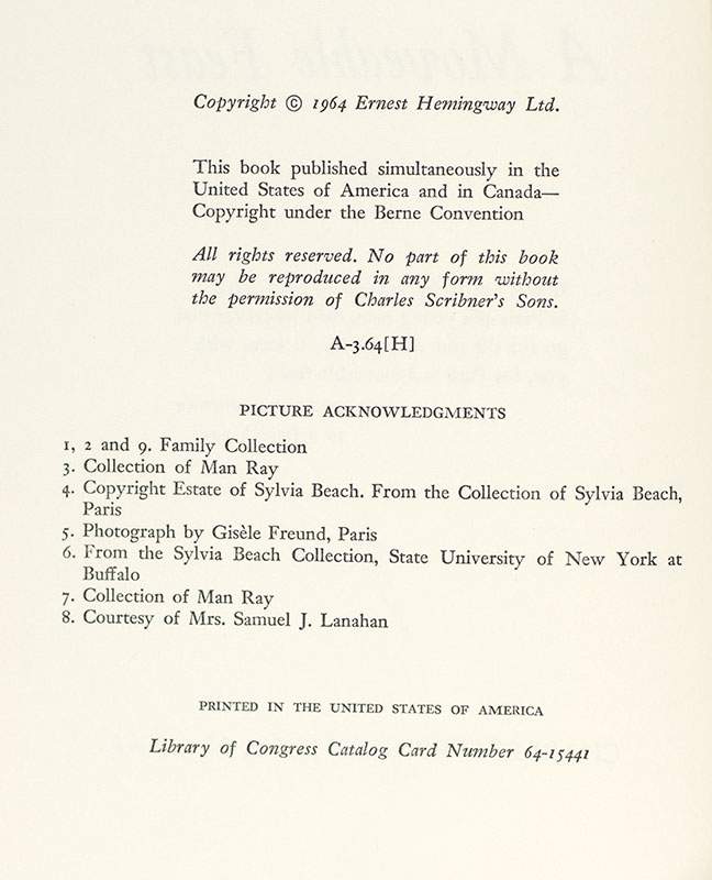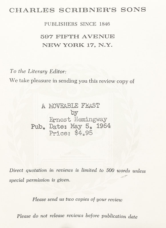 "This is how Paris was in the early days when we were very poor and very happy": Review Copy of the First Edition of Ernest Hemingway's A Moveable Feast
