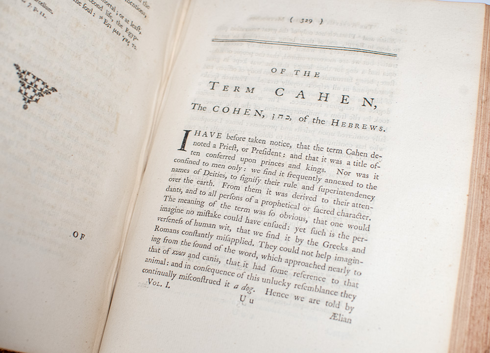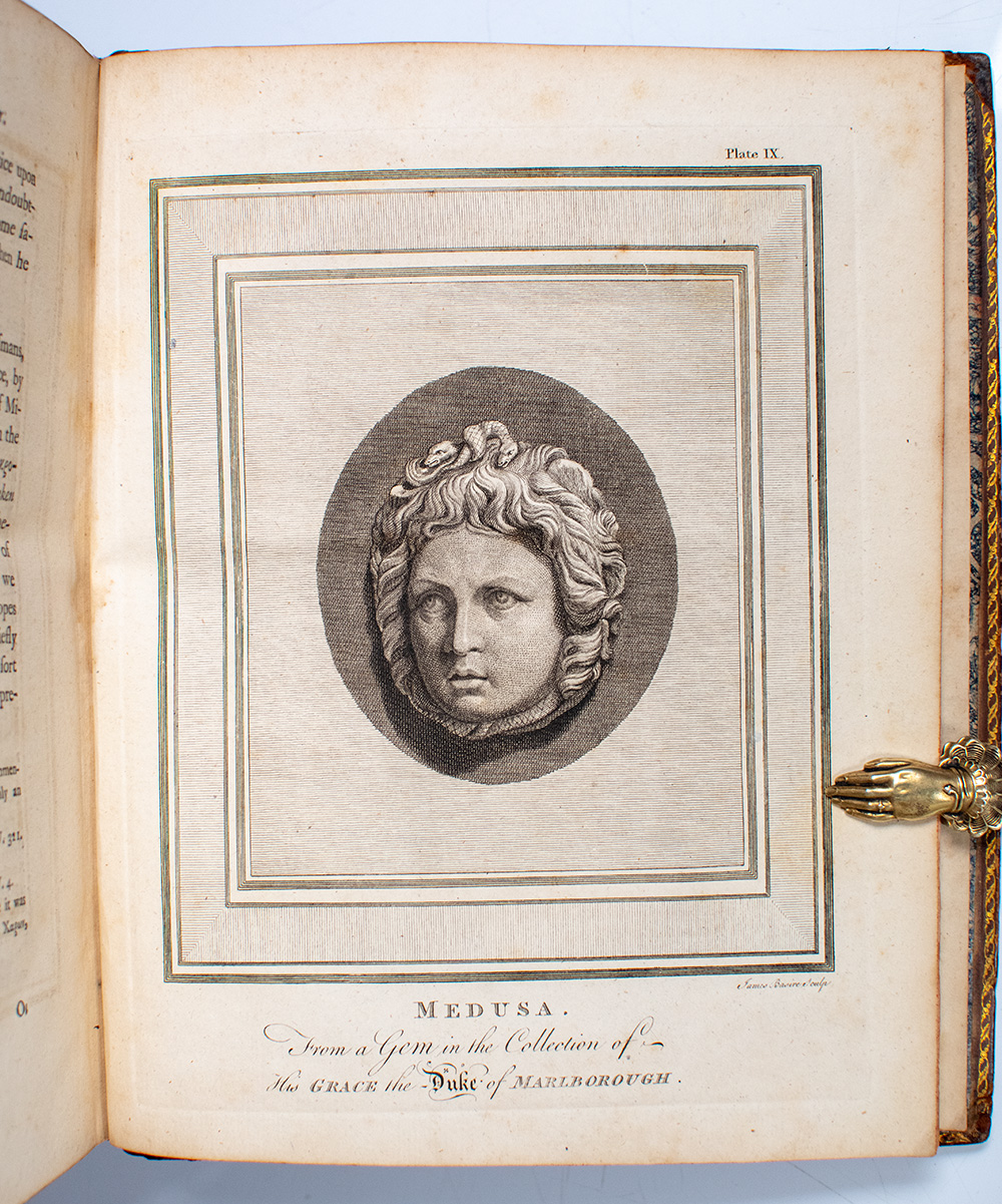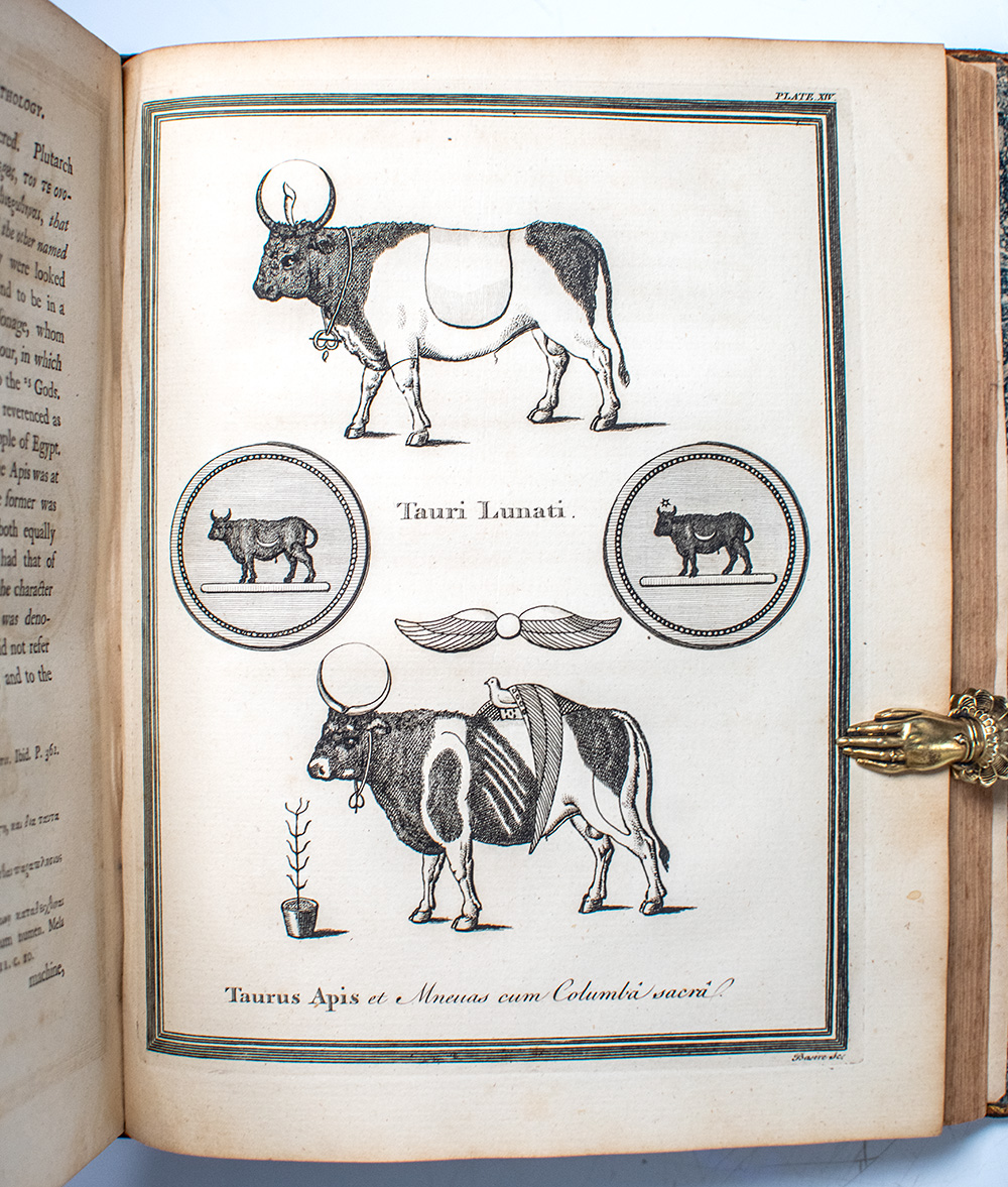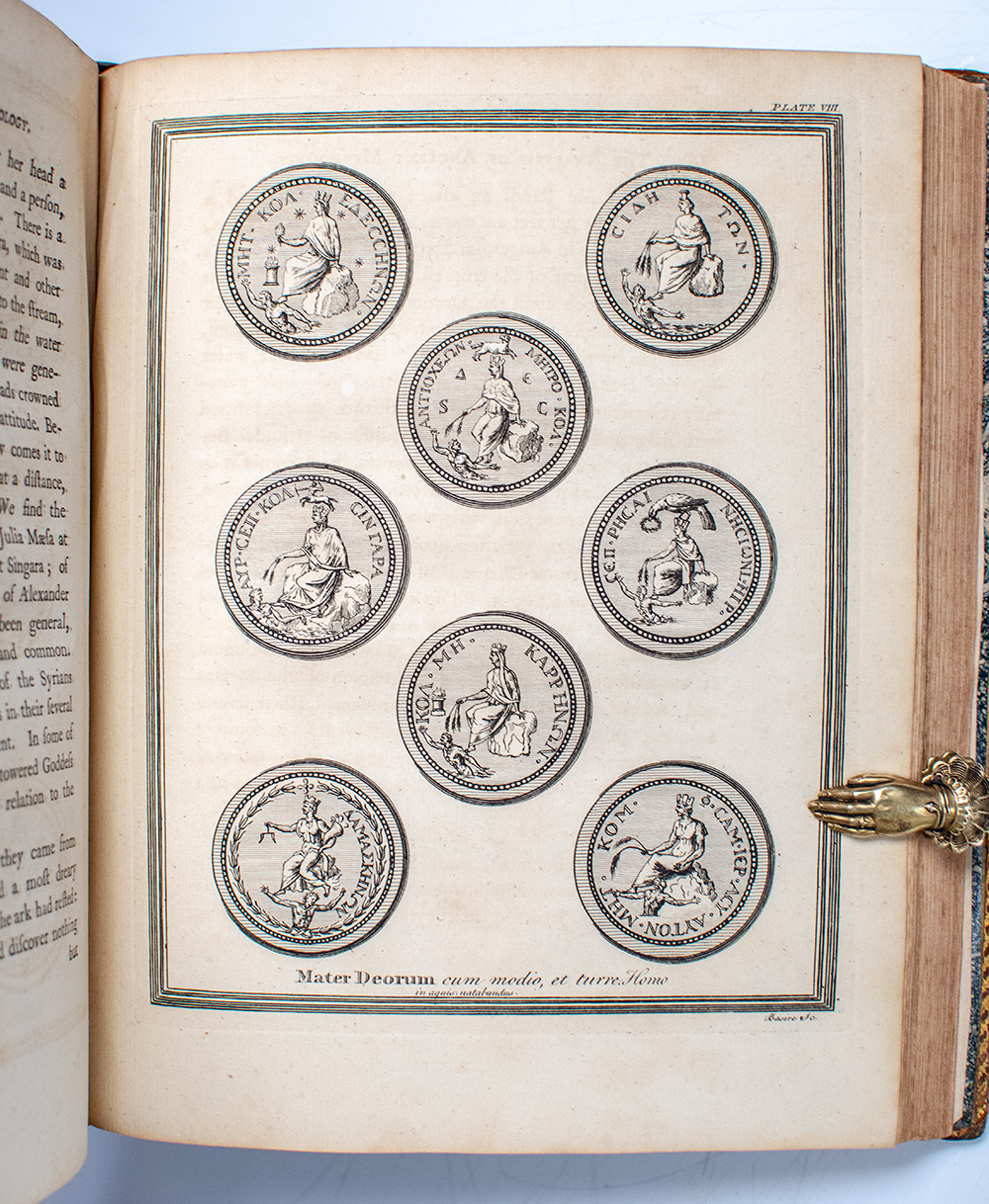 First edition of Bryant's Mythology, one of the most ambitious eighteenth-century attempts to reconcile classical mythology with biblical and historical truth. Royal quarto, three volumes bound in full period calf, rebacked, morocco spine labels lettered in gilt, elaborate gilt tooling to the spines in six compartments within raised gilt bands, gilt ruling and scrolling to the front and rear panels, gilt turn-ins and inner dentelles, marbled endpapers, illustrated with numerous engraved plates of coins, antiquities, gems, and ancient historical sites including two extra plates after Cipriani, beautifully engraved by Bartolozzi. In very good condition with archival tape repairs to the front gutters of Vols. I and III, rebacked with restoration to the spine tips and hinges. Armorial bookplates to the pastedowns and verso of the front endpapers, neat period ownership initials.