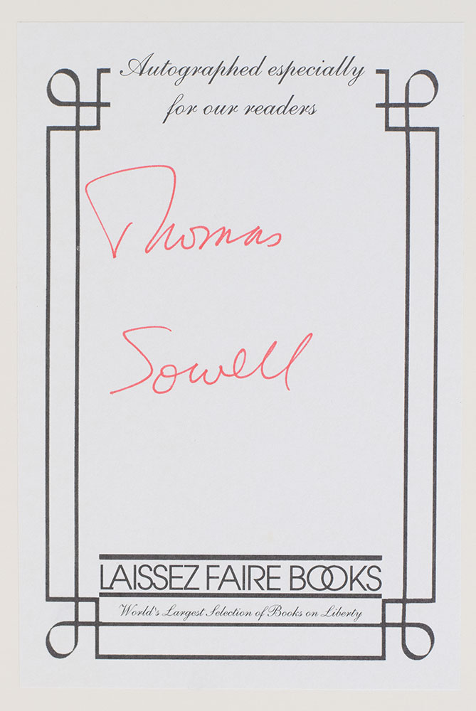 First edition of the economist's classic autobiography. Octavo, original half cloth. Signed by Thomas Sowell on the front free endpaper on a bookplate. Fine in a fine dust jacket.
