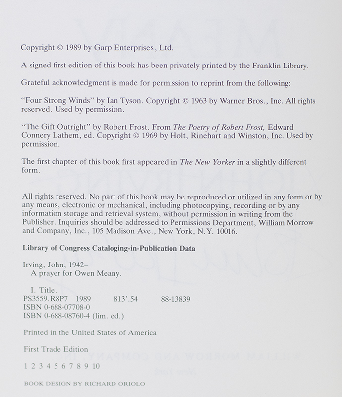 "I am a Christian Because of Owen Meany": First Edition of A Prayer For Owen Meany; Inscribed by John Irving