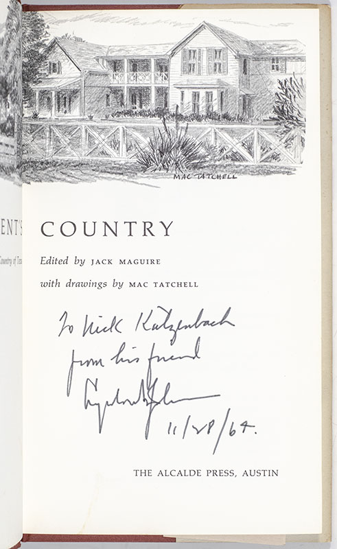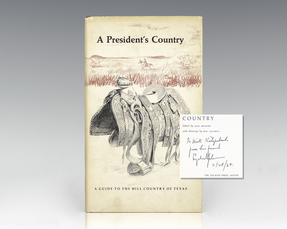 First edition of Texan writer Jack Maguire's work on "Hill Country" Texas, where Lyndon B. Johnson was born, raised, attended college, and ran for his first public office. Octavo, original cloth, illustrated with drawings by Mac Tatchell. Association copy, inscribed by Lyndon B. Johnson on the title page in the year of publication,"To Nick Katzenbach, from his friend, Lyndon B. Johnson, 11/28/64." The recipient was Nicolas Katzenbach, served as Attorney General under the Lyndon Johnson Administration. Katzenbach has been credited with providing advice after the assassination of John F. Kennedy that led to the creation of the Warren Commission. On November 25, 1963, he sent a memo to Johnson's White House aide Bill Moyers recommending the creation of a Presidential Commission to investigate the assassination. To combat speculation of a conspiracy, Katzenbach said the results of the FBI's investigation should be made public. He wrote, in part: "The public must be satisfied that Oswald was the assassin; that he did not have confederates who are still at large." Near fine in a near fine dust jacket.
