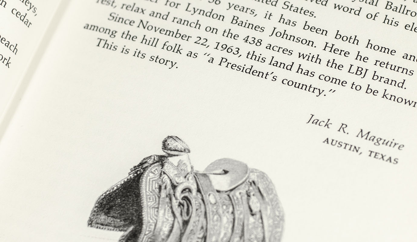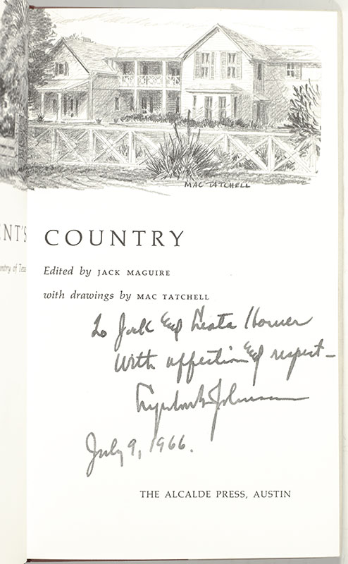 First edition of Texan writer Jack Maguire's work on "Hill Country" Texas, where Lyndon B. Johnson was born, raised, attended college, and ran for his first public office. Octavo, original cloth, illustrated with drawings by Mac Tatchell. Association copy, inscribed by Lyndon B. Johnson on the dedication page, “To Jack and Leota Horner with affection and respect Lyndon B. Johnson July 9, 1966.” The recipient, White House Correspondent Garnett D. Jack Horner, served as President of the White House Correspondents Association and covered Presidents from FDR to Gerald Ford. President Johnson often invited favored reporters to the LBJ Ranch, including Horner on multiple occasions throughout his Presidency. Near fine in a near fine dust jacket.