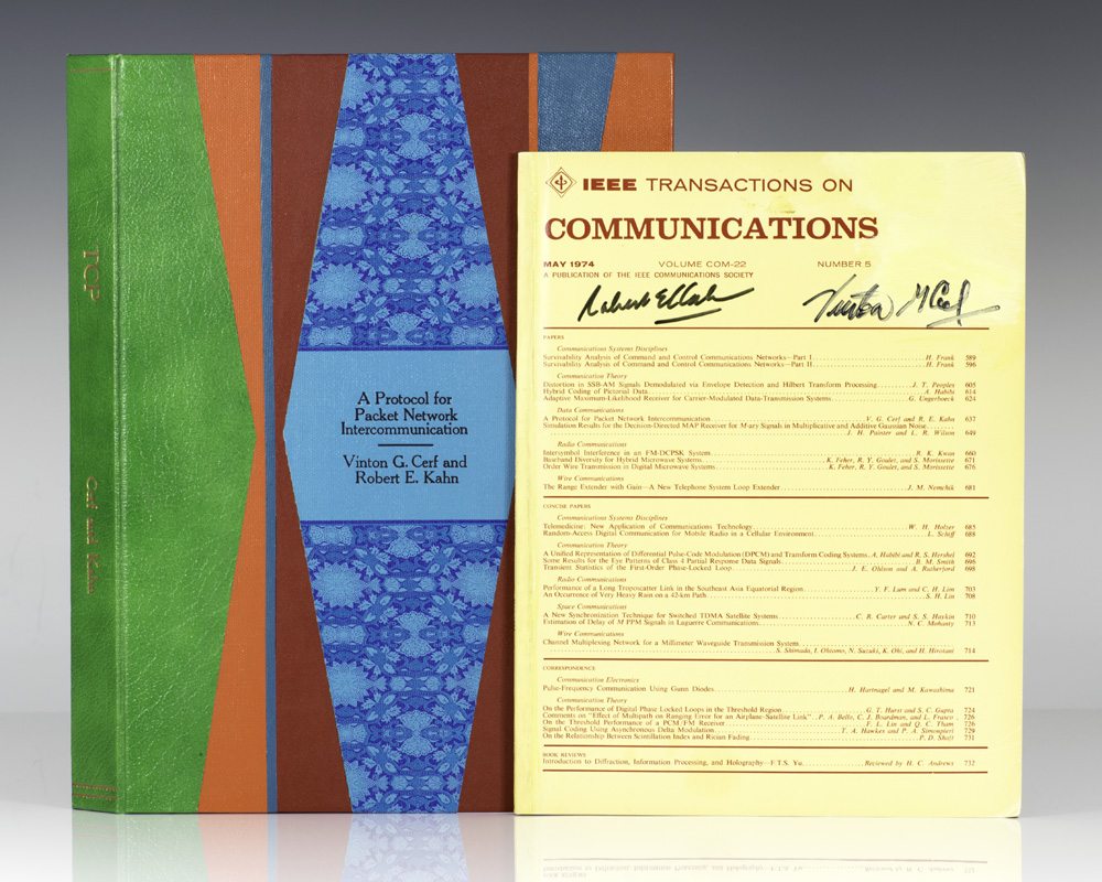 First edition of this landmark paper. IEEE Transactions and Communications, Volume Com-22, Number 5, May 1974, pages 589–733. Quarto, original wrappers. Signed by both Vinton Cerf and Robert Kahn on the front panel and also at their contribution in the article. In near fine condition with some light touch up to the front panel, rebacked. Housed in a custom clamshell box. Rare, especially signed.