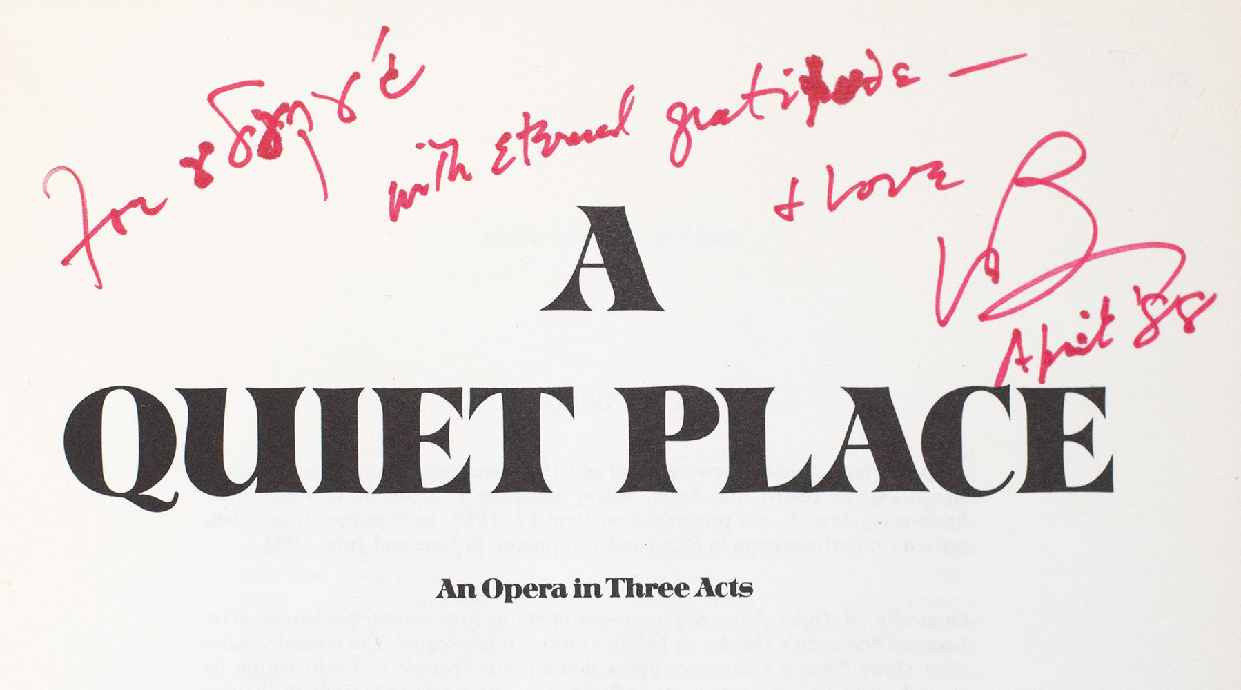 First edition of the piano and vocal score of Leonard Bernstein and Stephen Wadsworth's A Quiet Place; inscribed by Leonard Bernstein to his assistant and editor Jack Gottlieb